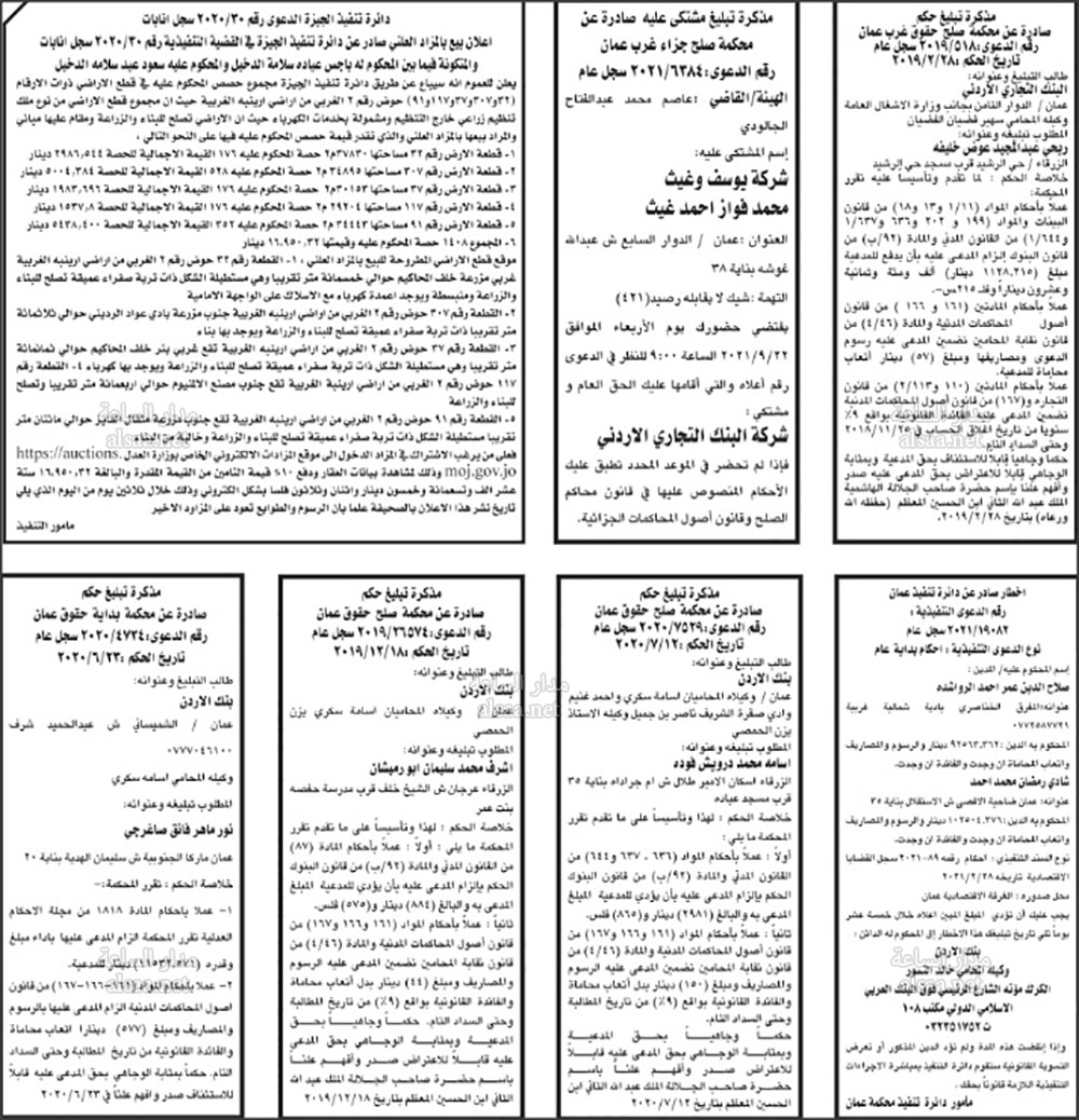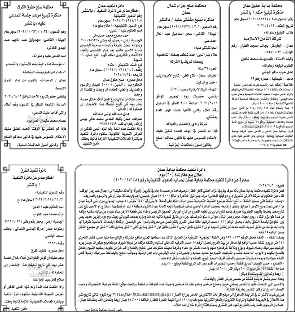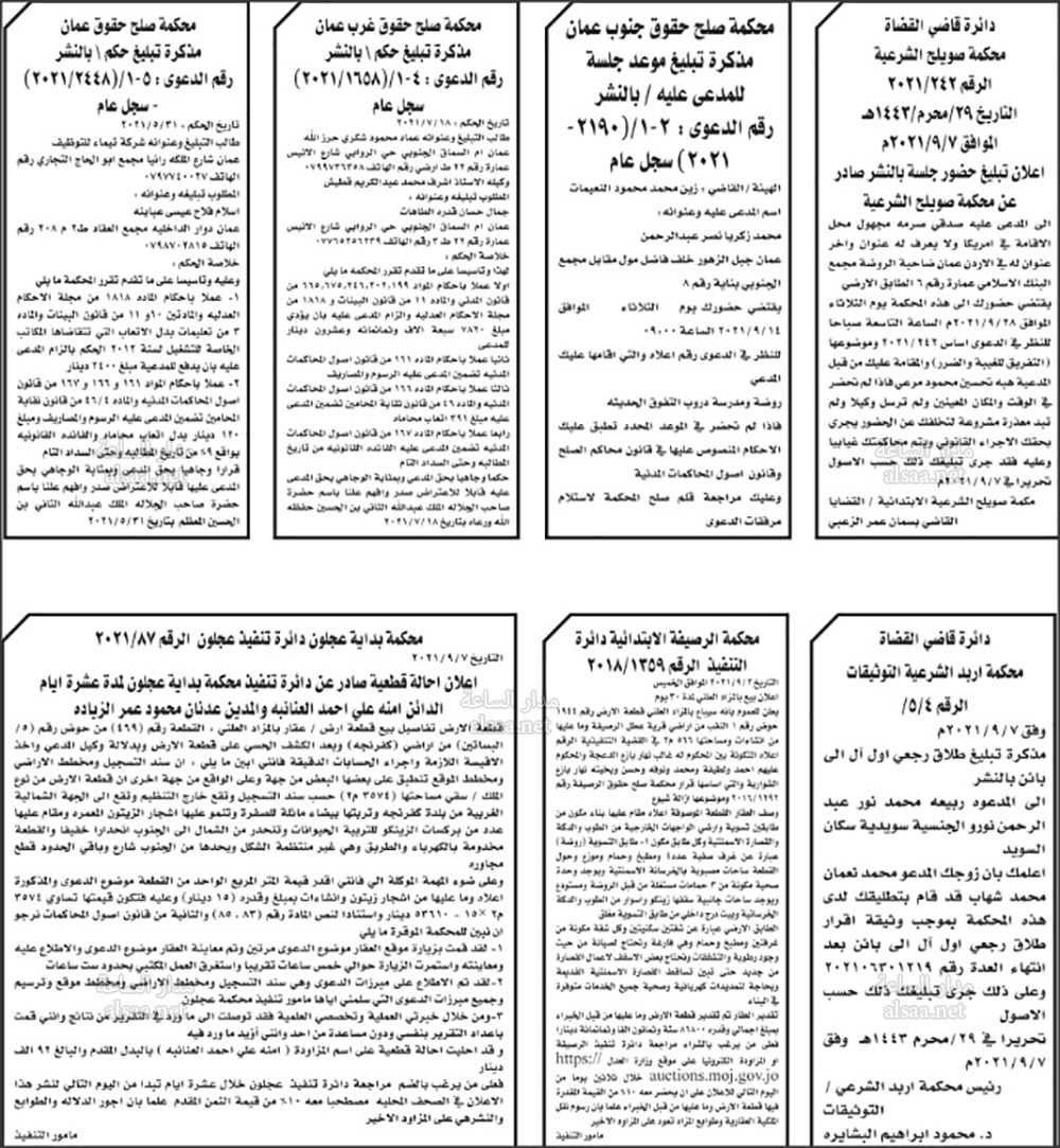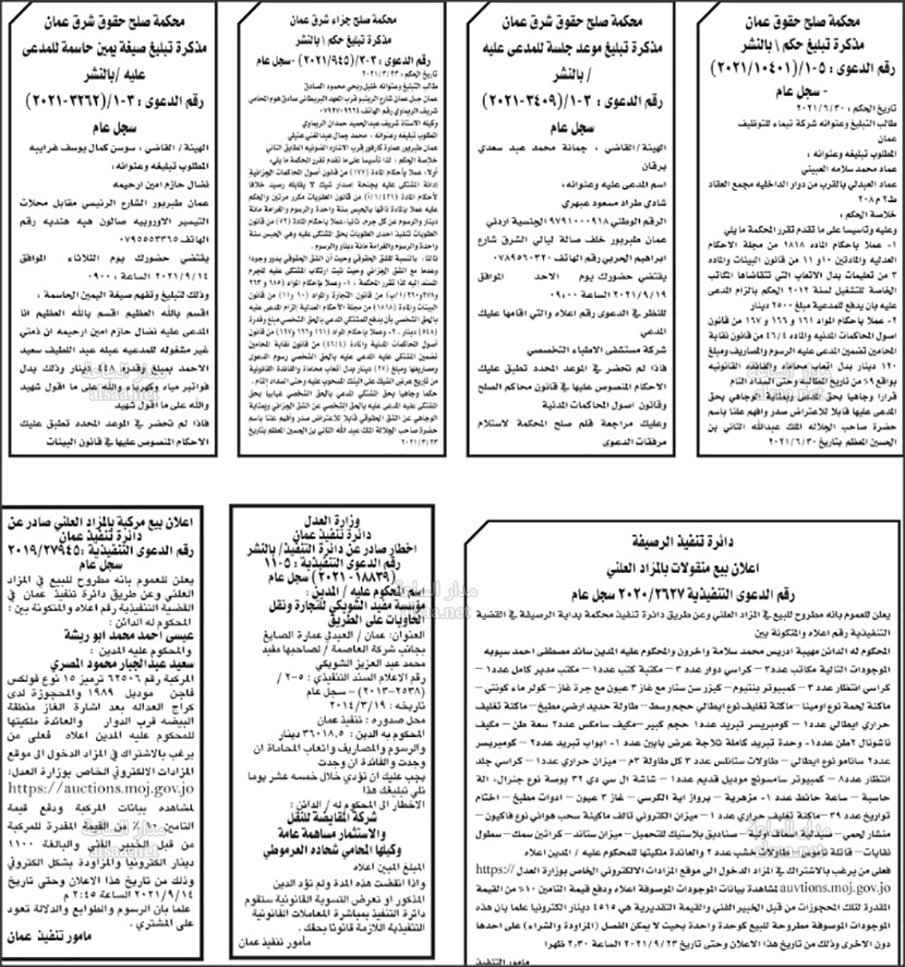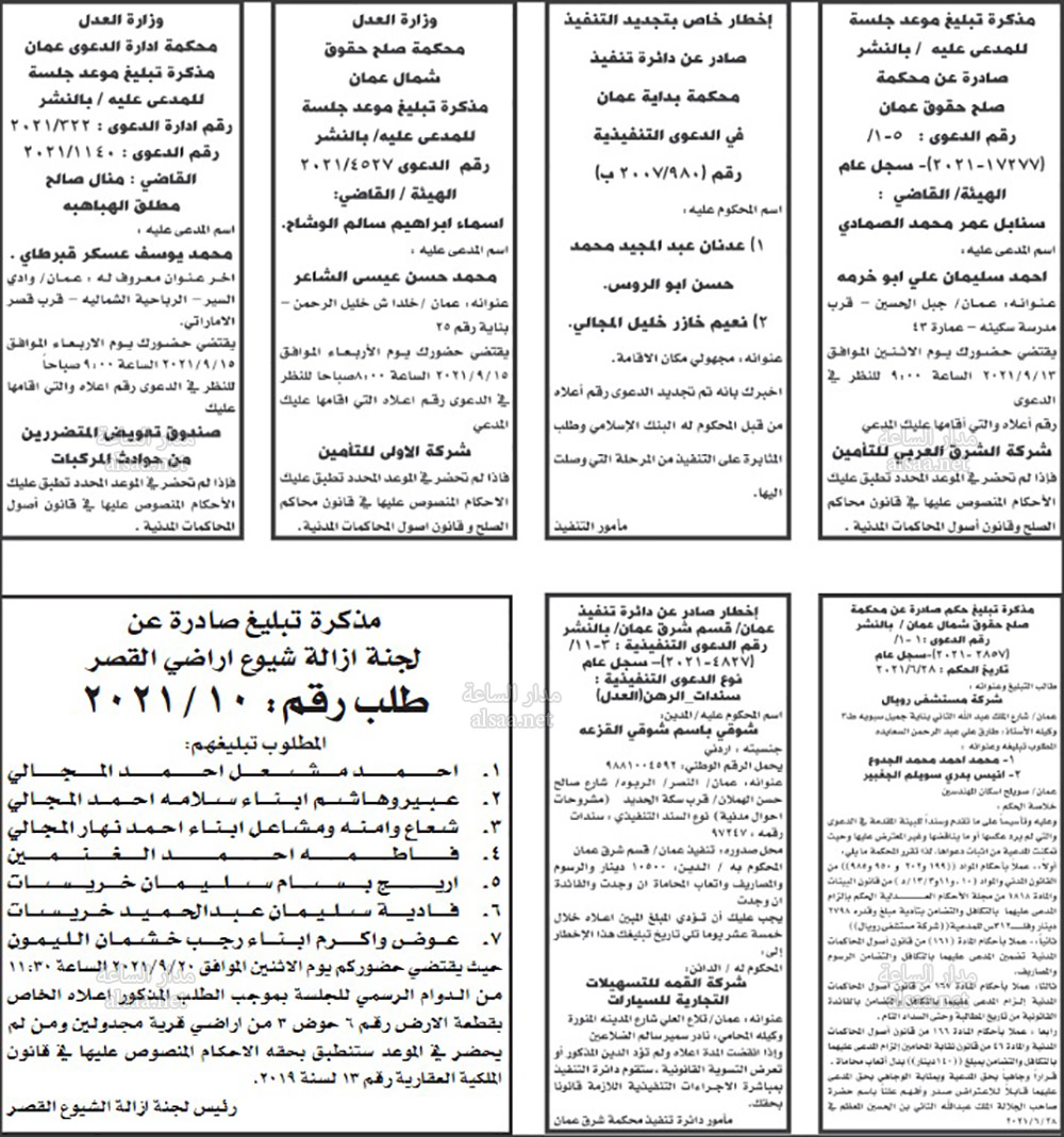 وكالة الناس – أعلنت محاكم الاربعاء عن مذكرات تبليغ مواعيد جلسات المحاكمة للمشتكى عليهم المذكورين تاليا.