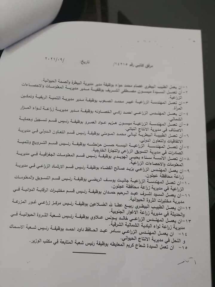 وكالة الناس –  قرر وزير الزراعة المهندس خالد الحنيفات وبناء على تنسيب الامين العام اجراء تشكيلات ادارية في مديريات الوزارة.
