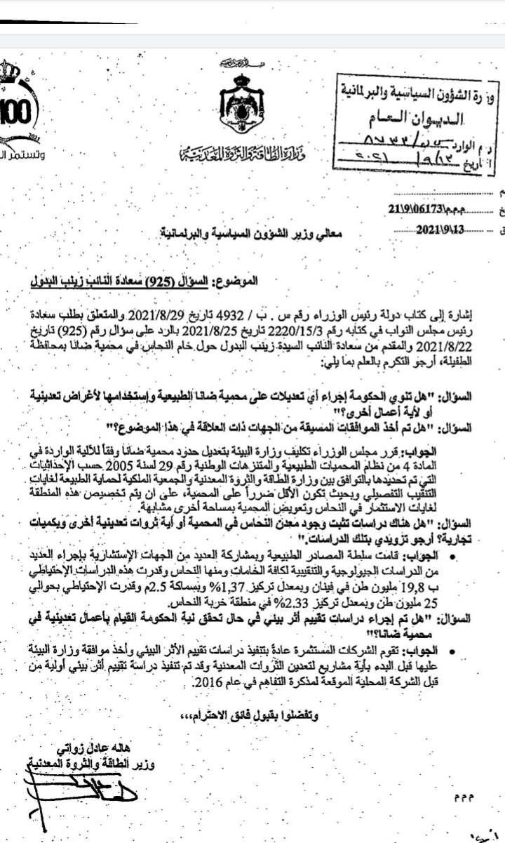 1- هل تنوي الحكومة إجراء تعديلات على محمية ضانا الطبيعية واستخدامها لأغراض تعدينية أو لأية أعمال أخرى؟
