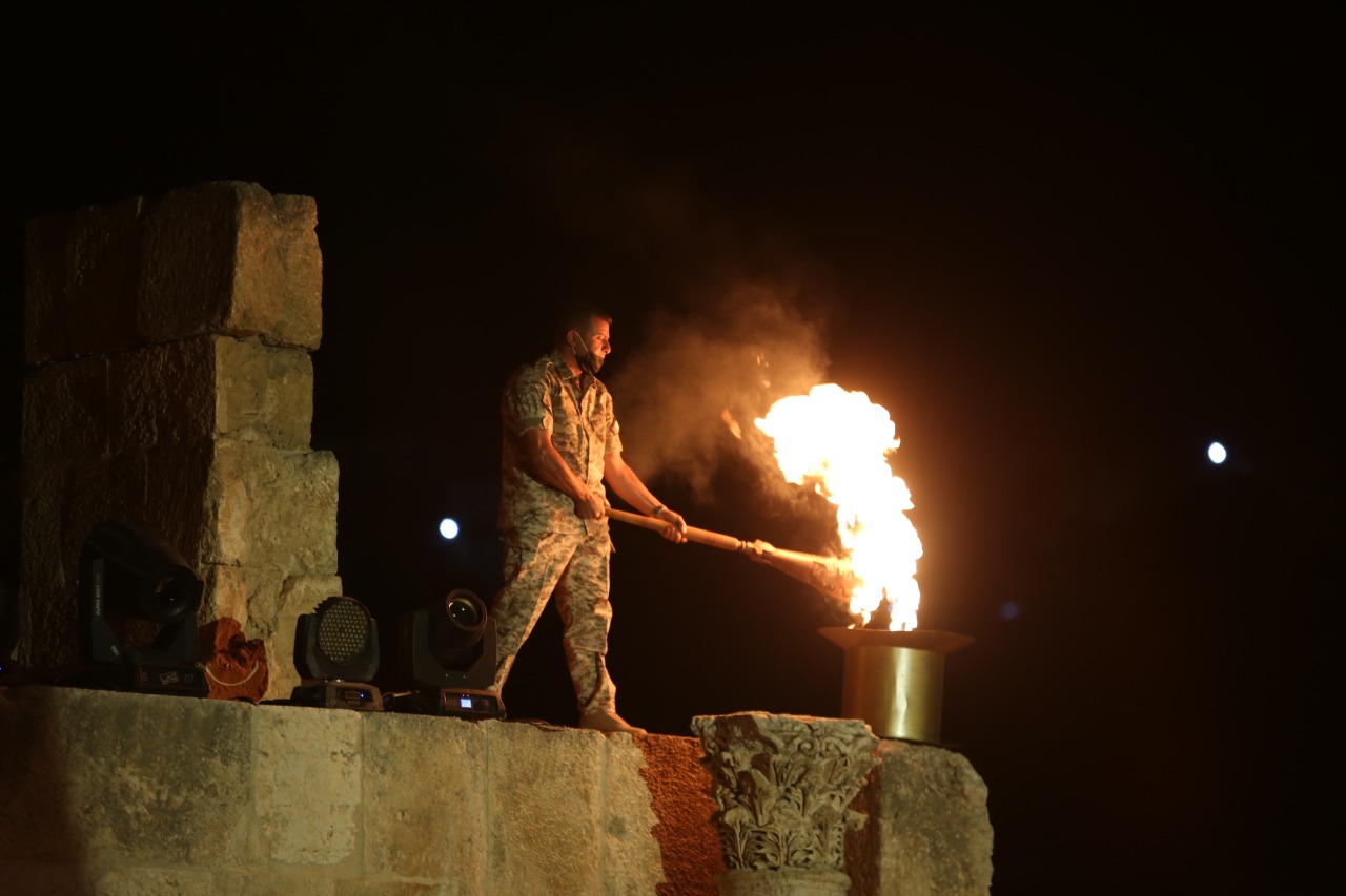 وبعد انتهاء الاستعراض اوقد راعي الحفل شعلة المهرجان معلنا انطلاق الفعاليات، وفي هذه الاثناء تقدم الفرقة الاستعراضية لوحة فنية راقصة بالمشاعل في تاكيد واضح على استمرار الفعل الثقافي والفني في جرش المدينة التي لا ينقطع عنها الابداع ولا تتوقف فيها مسيرة الفن ومشاعل النور، ثم الانتقال للوحة تؤكد السوسنة الوطنية قبل ان تنطلق المغناة الوطنية “مع عبدالله”.