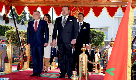 وأطلقت المدفعية إحدى وعشرين طلقة تحية لجلالة الملك عبدالله الثاني، وعزفت الموسيقى السلامين الملكي الأردني والملكي المغربي، فيما استعرض الزعيمان حرس الشرف الذي اصطف لتحيتهما.