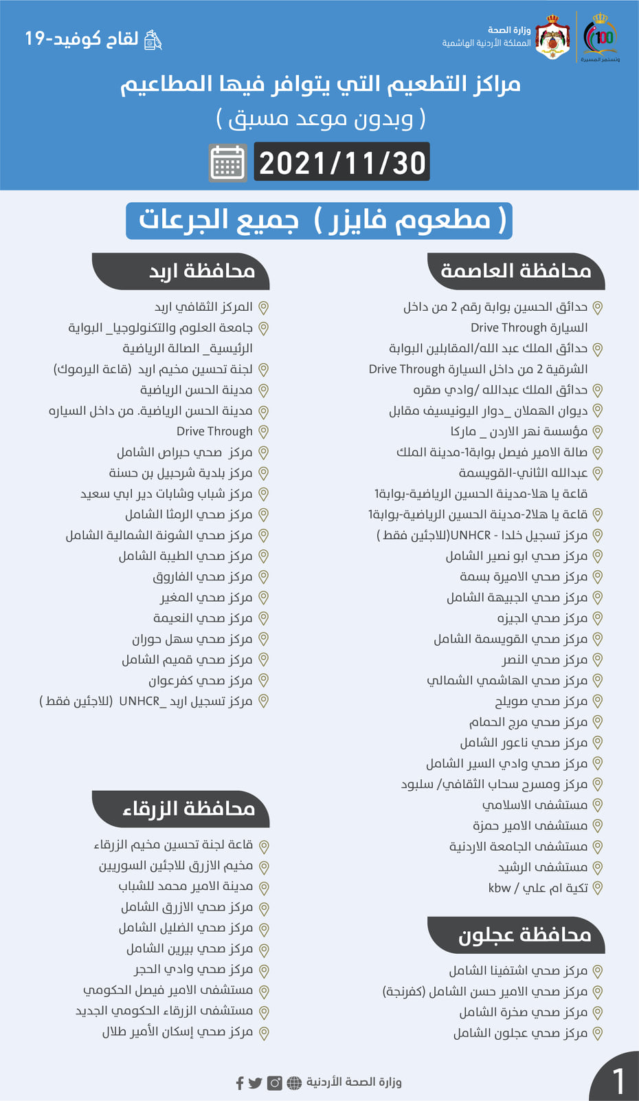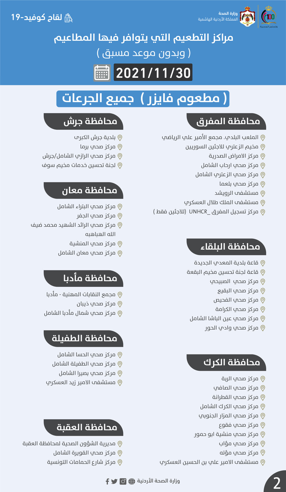مراكز التطعيم ليوم الثلاثاء 2021/11/30 التي يتوافر فيها المطاعيم #جميع_الجرعات :