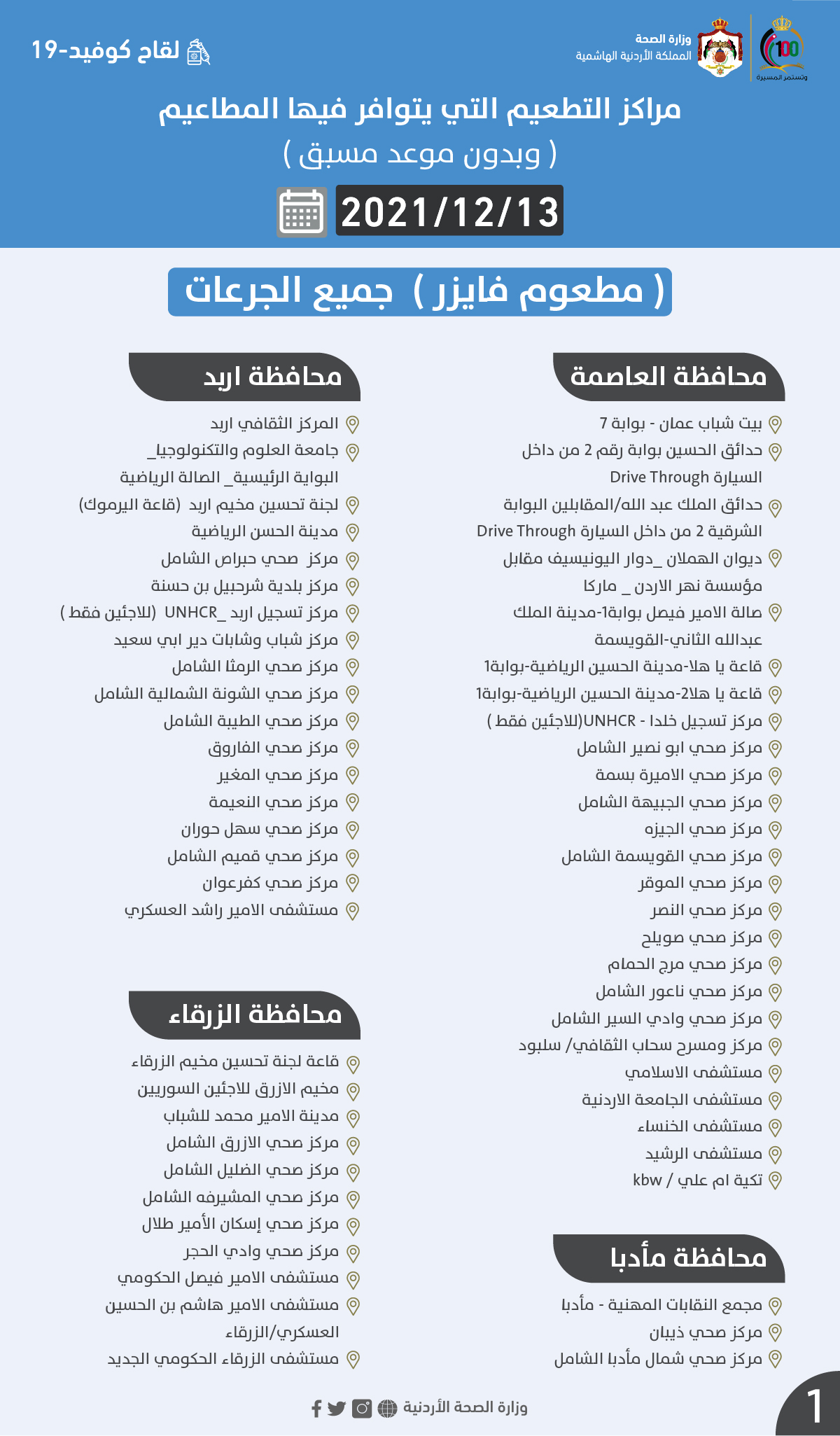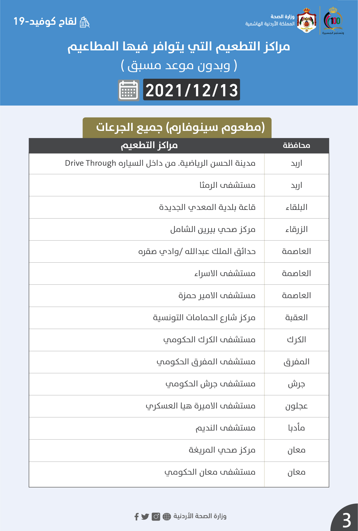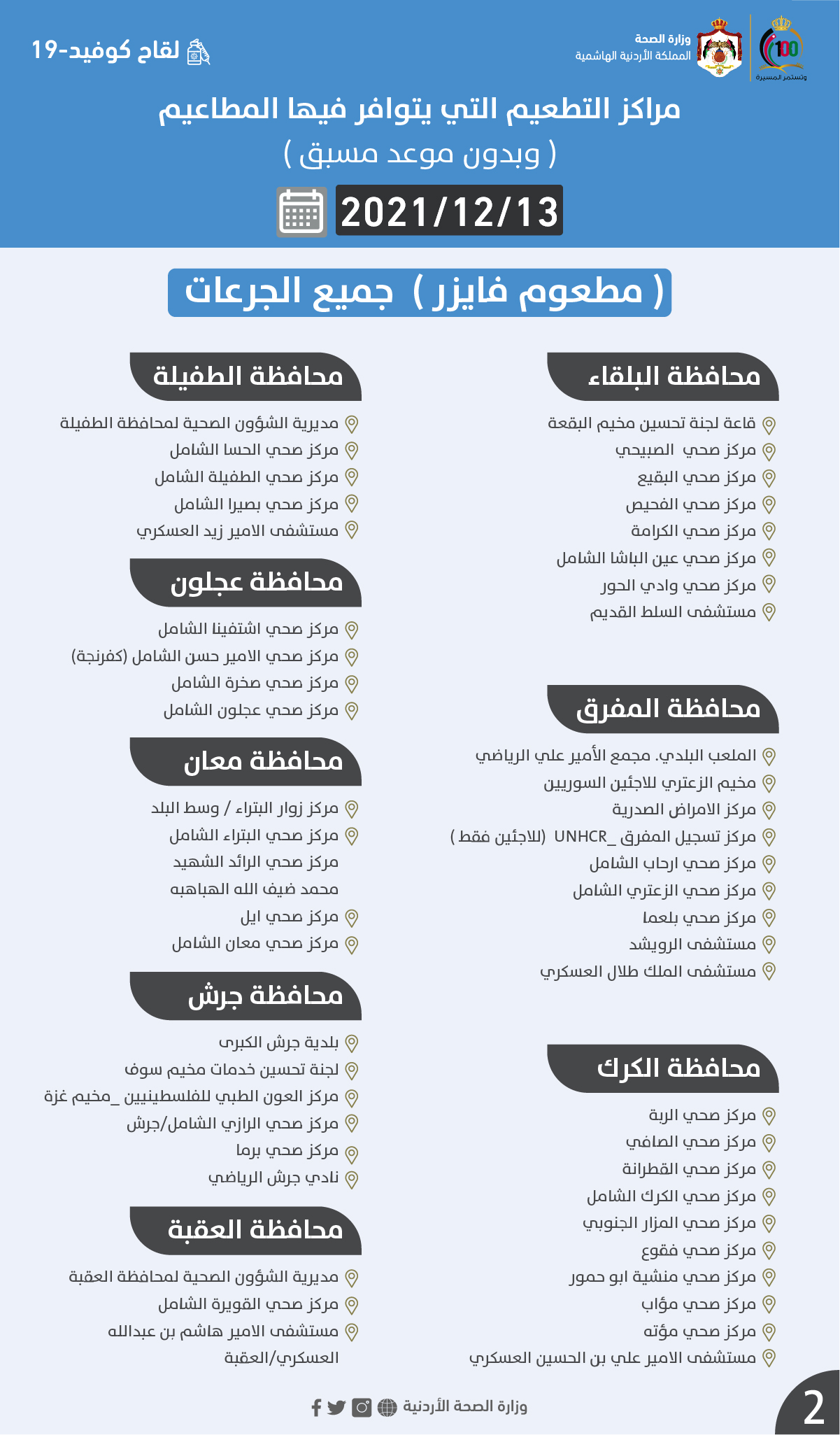 الصحة تعلن مراكز التطعيم الاثنين (أسماء) On ديسمبر 12, 2021 Share وكالة الناس – أعلنت وزارة الصحة مراكز التطعيم ضد فيروس كورونا الاثنين. وتالياً المراكز:
