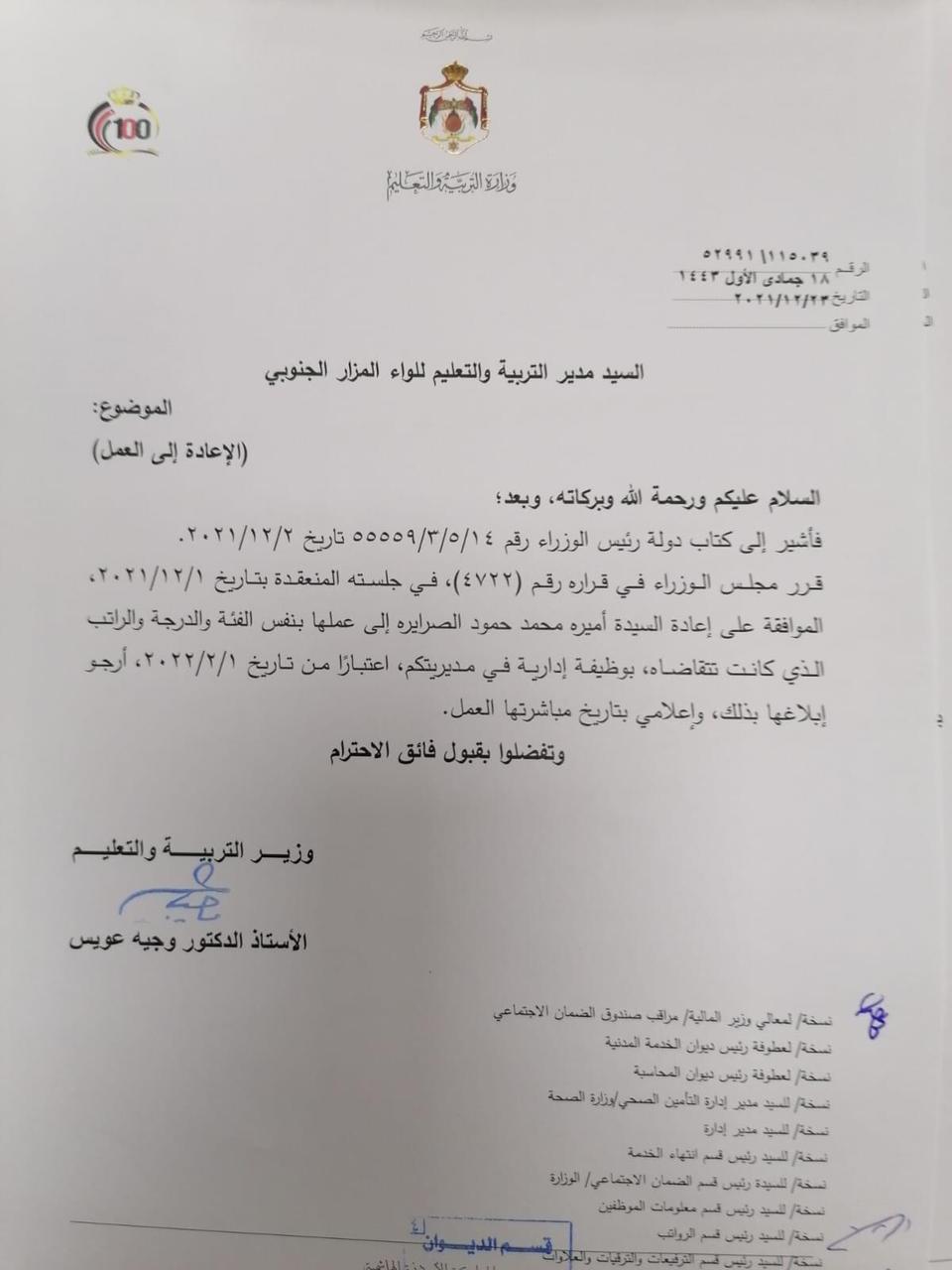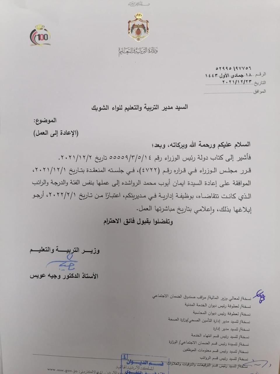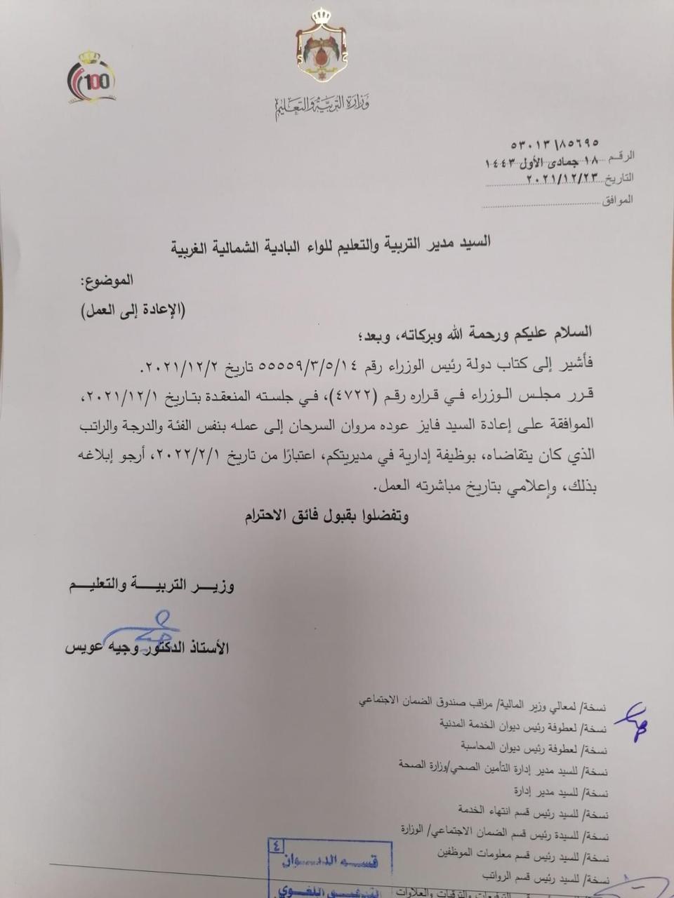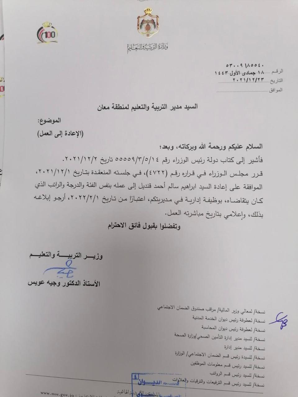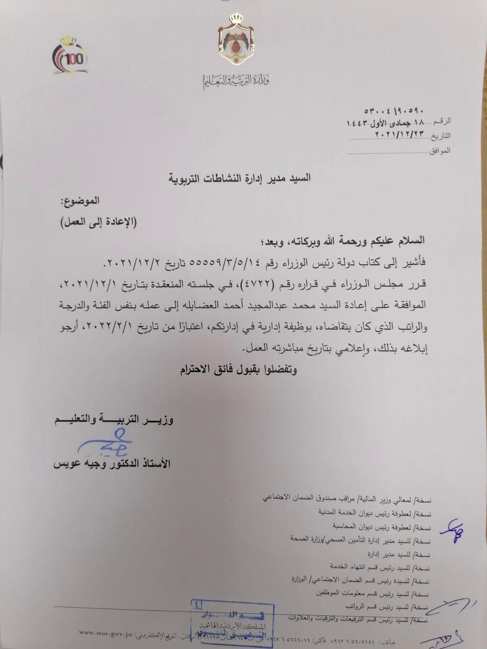 عويس يقرر إعادة معلمين وموظفين إلى عملهم ( أسماء ) On ديسمبر 23, 2021 Share وكالة الناس – قرر وزير التربية والتعليم الدكتور وجيه عويس، إعادة عدد من الموظفين إلى العمل اعتبارا من 1 شباط المقبل. وجاء القرار استنادا إلى قرار مجلس الوزراء رقم 4722 في جلسته المنعقدة بتاريخ 1/12/2021 واشارة الى كتاب رئيس الوزراء رقم 14/5/3/55559 تاريخ 2/2/2021. وتاليا التفاصيل والأسماء: