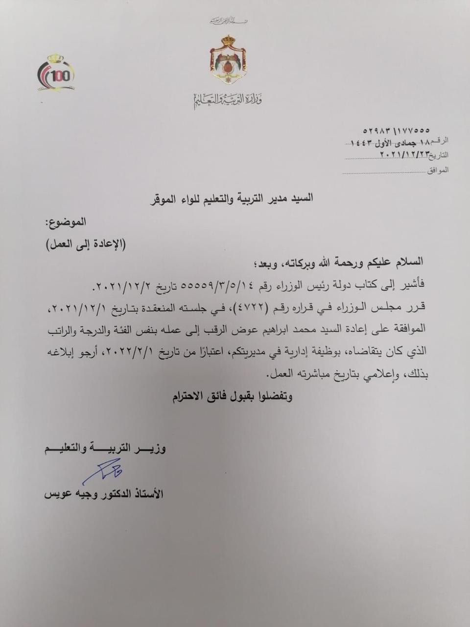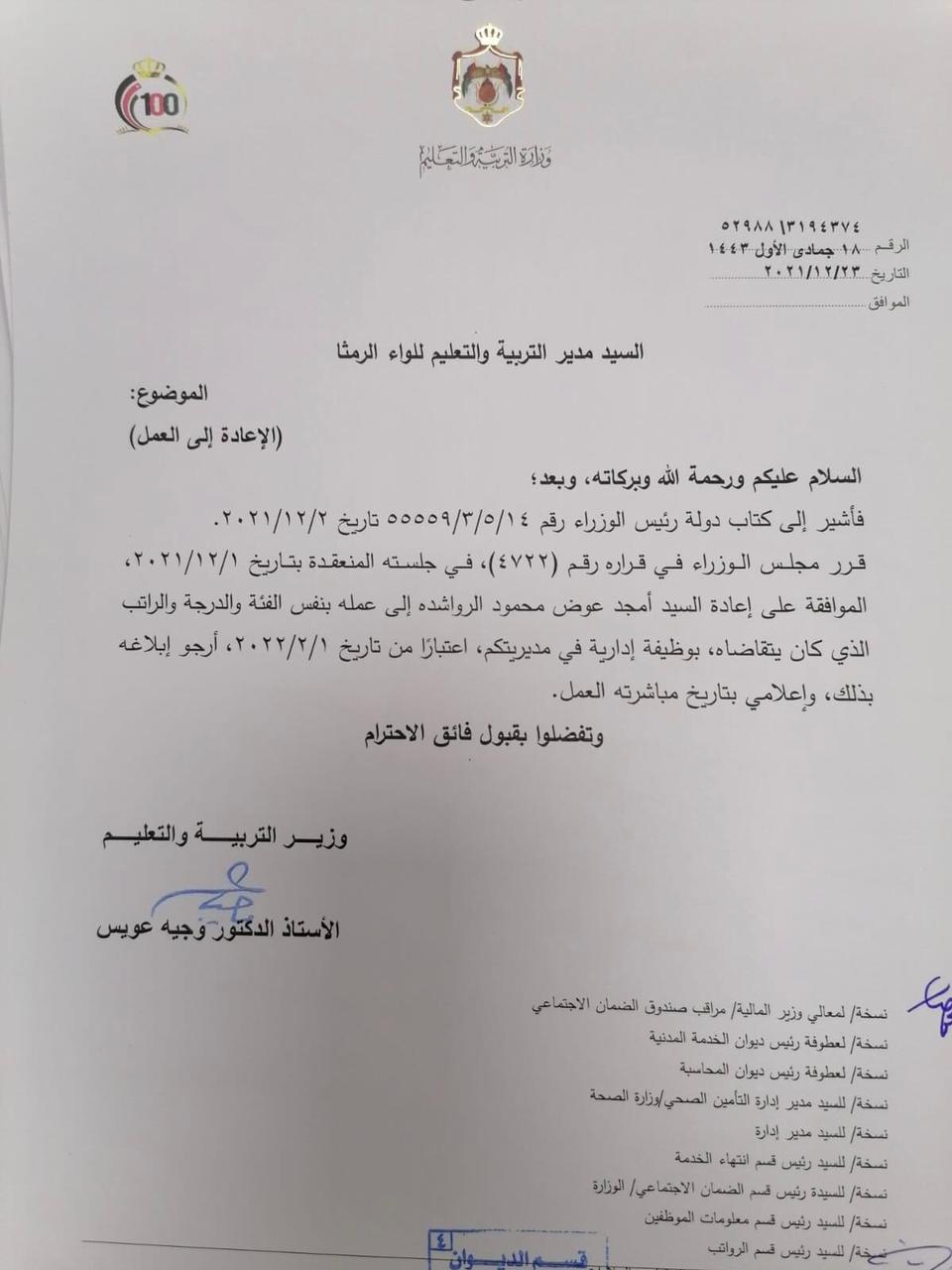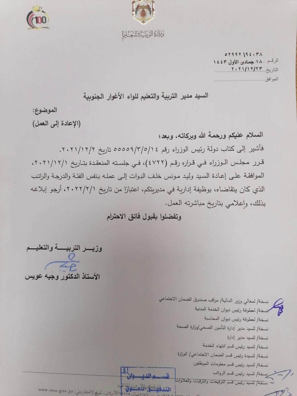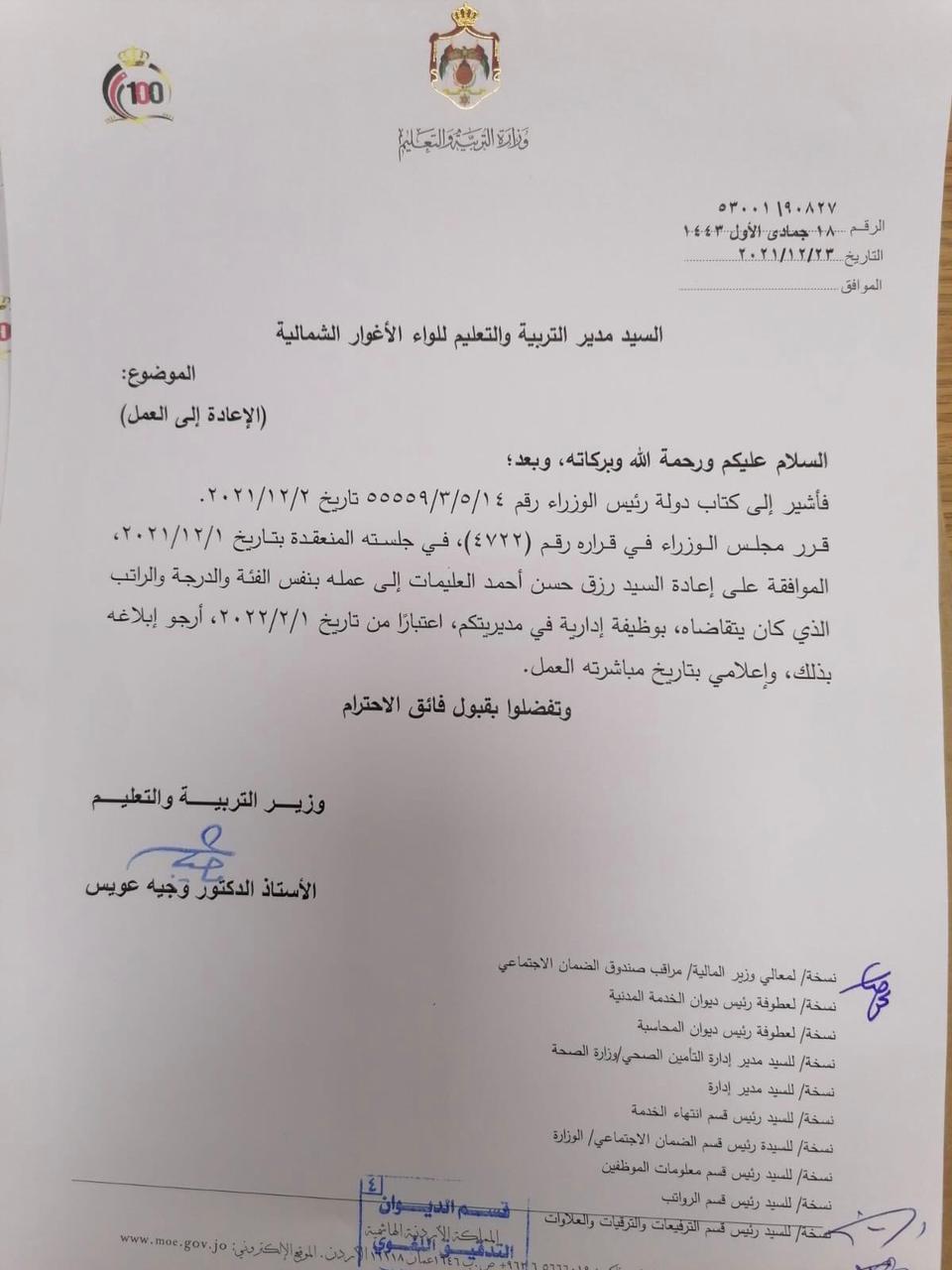 وجاء القرار استنادا إلى قرار مجلس الوزراء رقم 4722 في جلسته المنعقدة بتاريخ 1/12/2021 واشارة الى كتاب رئيس الوزراء رقم 14/5/3/55559 تاريخ 2/2/2021.