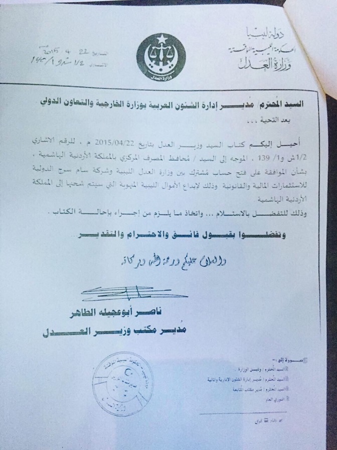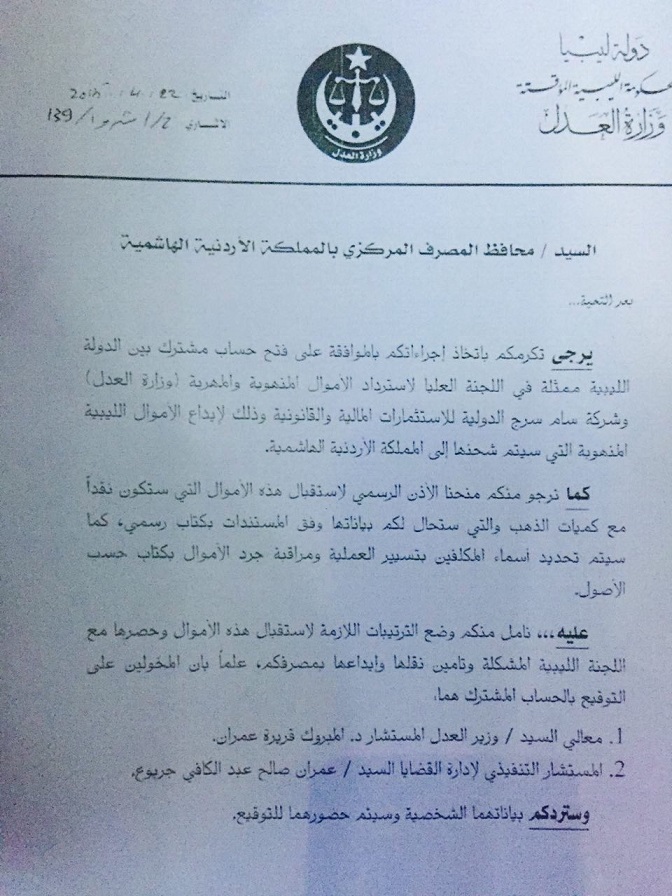 وجاء في الوثائق الموجهة إلى محافظ المصرف المركزي بتاريخ 22-4-2015 “يرجى التكرم بالموافقة على فتح حساب مشترك بين الدولة الليبية ممثلة باللجنة العليا لاسترداد الأموال المنهوبة وشركة سام سرج الدولية للاستثمارات المالية والقانونية، وذلك لإيداع الأموال الليبية المنهوبة التي سيتم شحنها إلى المملكة الهاشمية”.