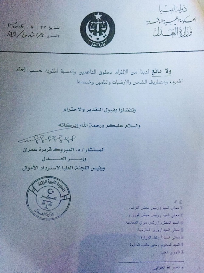 وذكرت أن الذين تم تخويلهم بالتوقيع على الحساب المشترك هما وزير العدل المبروك قريرة والمستشار التنفيذ لإدارة القضايا عمران صالح جربوع.