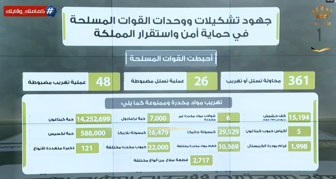وأضاف عبر برنامج درع الوطن الذي يبث على شاشة التلفزيون الأردني، أن القوات التي تم نشرها هي مخصصة ومدربة ومسلحة بالاحتياجات كافة مسندة بطائرات سلاح الجو الملكي، مؤكدا انها نفذت عمليات كبيرة في مساندة التشكيلات سواء في المنطقة العسكرية الشمالية او الشرقية.