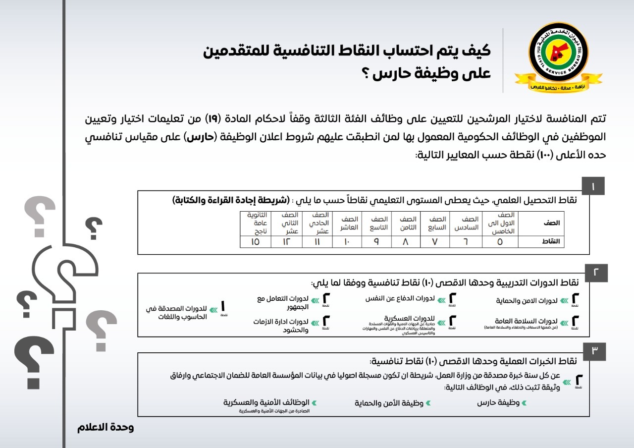 وأوضح الناصر ان آليات احتساب النقاط التنافسية للمتقدمين على وظيفة حارس في وزارة التربية والتعليم عبر موقع الديوان الالكتورني، مؤكدا التزام الديوان بمبدأ الشفافية والعدالة وتكافؤ الفرص بين المرشحين.