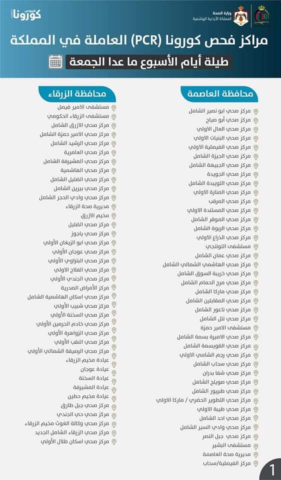 الصحة تعلن مراكز فحص كورونا ( أسماء ) On يناير 28, 2022 Share وكالة الناس – أعلنت وزارة الصحة الجمعة، قائمة بمراكز فحص كورونا (PCR) العاملة طيلة أيام الأسبوع ما عدا يوم الجمعة في المملكة. ويكون دوام المراكز من الساعة 10 صباحا حتى 3 مساء. وتالياً المراكز: