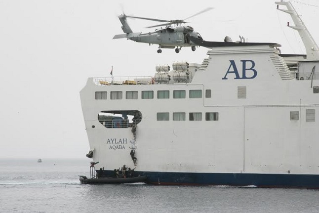 كما تابع مندوب جلالة الملك سمو الأمير فيصل بن الحسين بحضور سمو الأمير هاشم بن الحسين اليوم تمريناً  مشتركاً لمكافحة القرصنة البحرية شاركت فيه وحدات من القوة البحرية الملكية والعمليات الخاصة المشتركة اضافة إلى الوحدات الخاصة بمكافحة القرصنة البحرية من كل من الباكستان وأمريكيا وفرنسا وبلجيكيا حيث اشتمل على عملية تخليص باخرة أثناء الحركة والتي تعد من أصعب الاحتمالات التي تواجه فرق مكافحة الإرهاب وعلى عمليات الإنزال البحري على الشواطئ لمواجهة أهداف مفترضة بإسناد من مجموعة الزوارق من القوة البحرية الملكية وطائرات الليتل بيرد والبلاك هوك التابعة للواء الأمير هاشم بن عبد الله لواء الطيران الملكي /5 وطائرات عامودية من سلاح الجو الأمريكي.