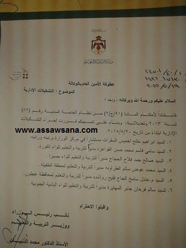 كما تضمن القرار نقل سامي قاسم القواعرة مديرا للتربية والتعليم للواء الكورة والمهندس عادل سامح رواشدة مديرا لتربية وتعليم محافظة عجلون.