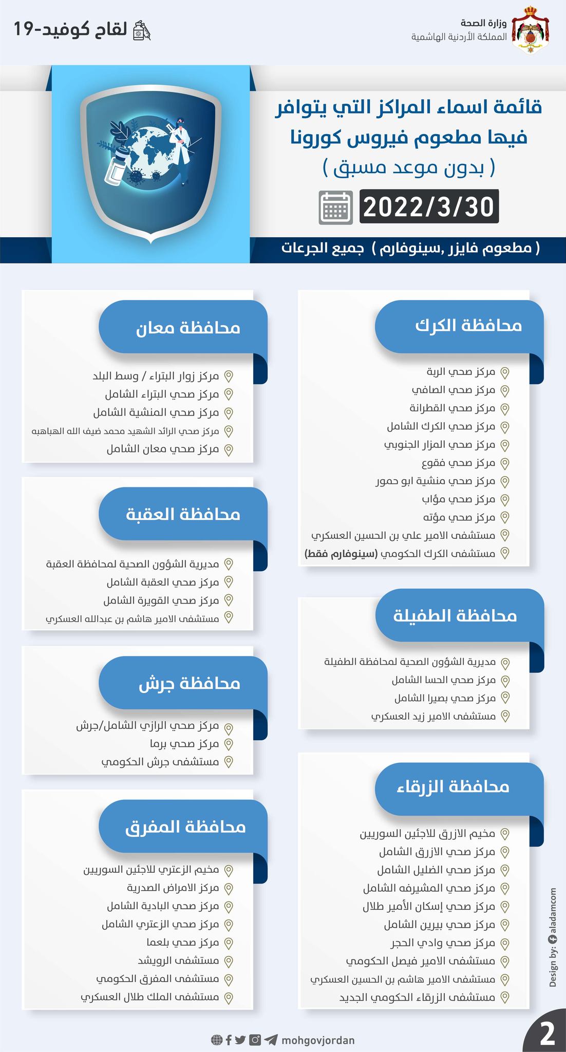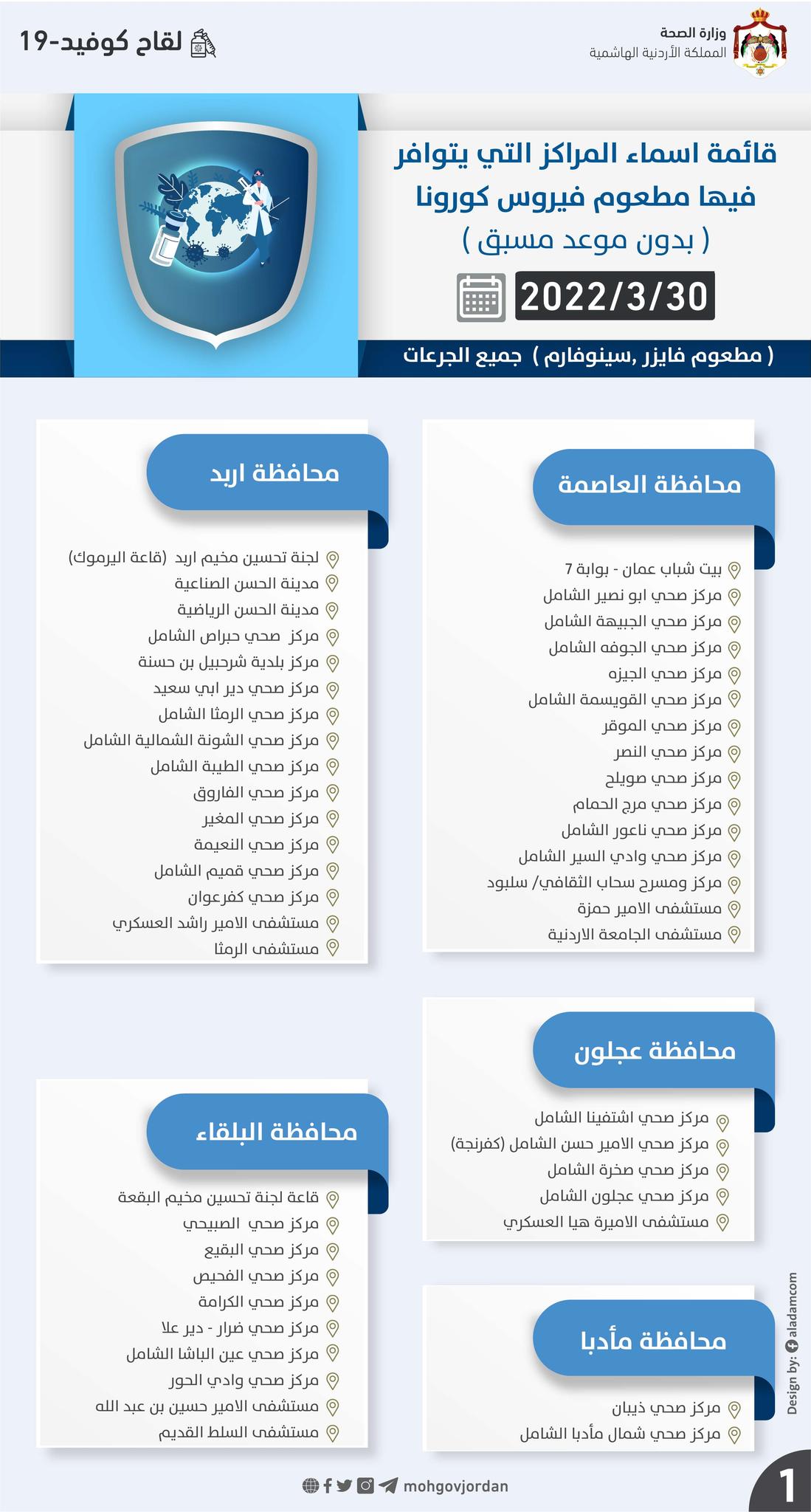 مراكز تطعيم كورونا الاربعاء (اسماء) On مارس 29, 2022 Share وكالة الناس – أعلنت وزارة الصحة قائمة باسماء المراكز التي يتوافر فيها مطعوم فيروس كورونا (بدون موعد مسبق) من جميع الجرعات ليوم الاربعاء. وقالت الوزارة إن دوام مراكز المطاعيم من الساعة 8:00 صباحاً – 3:00 مساءً. وتاليا المراكز: