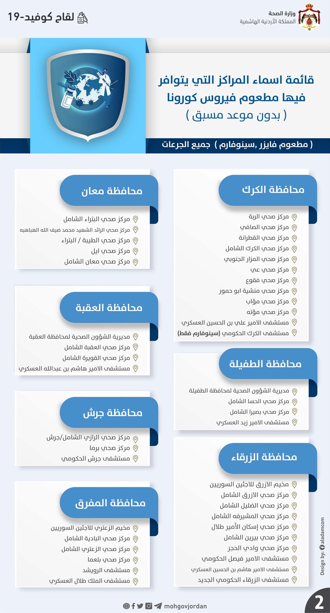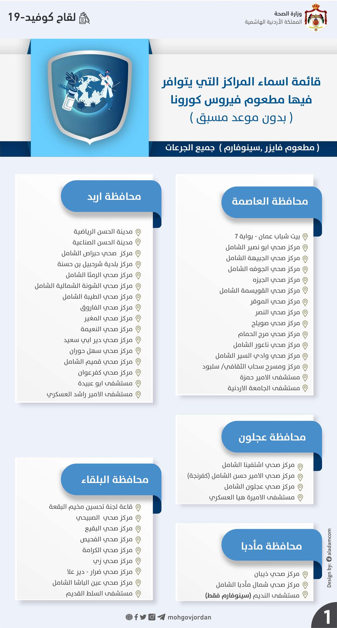 مراكز تطعيم كورونا ليوم الأحد On أبريل 23, 2022 Share وكالة الناس – أعلنت وزارة الصحة قائمة باسماء المراكز التي يتوافر فيها مطعوم فيروس كورونا (بدون موعد مسبق) من جميع الجرعات ليوم الاحد. وقالت الوزارة إن دوام مراكز المطاعيم من الساعة 9:00 صباحاً – 2:00 مساءً. وتاليا المراكز: