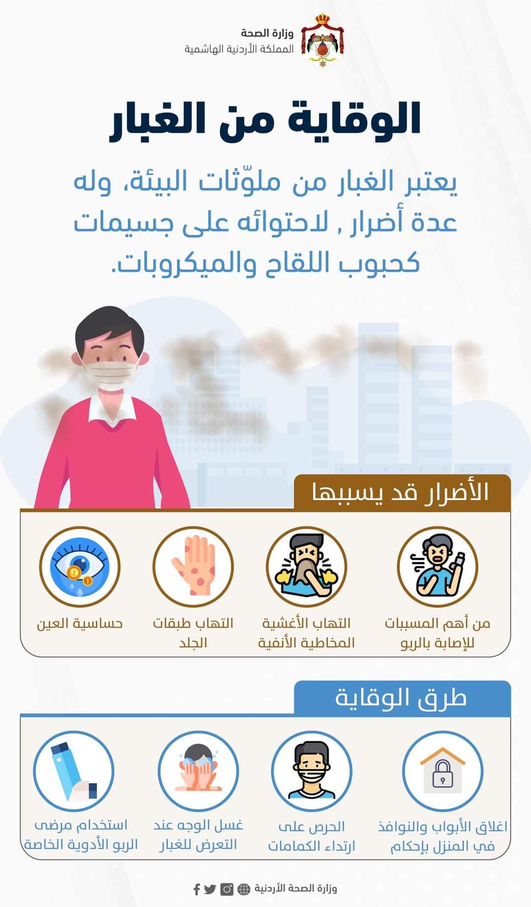 وكالة الناس – وجهت وزارة الصحة، نصائح مهمة للمواطنين وذلك تجنا لحدوث أي مضاعفات صحية، نظرا للحالة الجوية التي تسود المملكة وزيادة نسبة الغبار والأتربة.