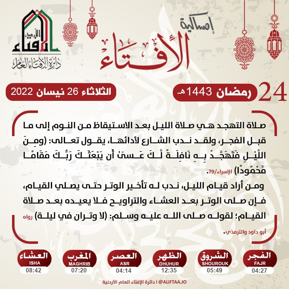 وكالة الناس – بينت دائرة الإفتاء العام في إمساكية اليوم الرابع والعشرين من شهر رمضان المبارك فضل صلاة التهجد ووقت أدائها.