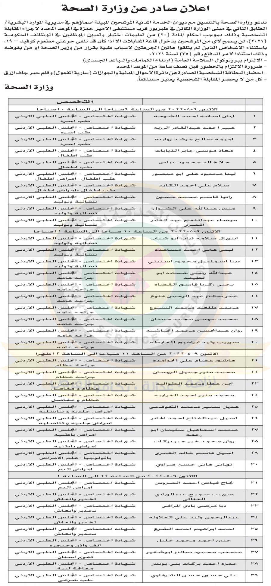 وكالة الناس – دعت وزارة الصحة بالتنسيق مع ديوان الخدمة المدنية المرشحين المبينة اسماؤهم التواجد في مديرية الموارد البشرية/ الطابق الثاني في مبنى الوزارة الكائن في طبربور قرب مستشفى الامير حمزة في الموعد المحدد لاجراء المقابلة الشخصية وذلك بموجب احكام المادة (٢٠) من تعليمات اختيار وتعيين الموظفين في الوظائف الحكومية (۲۰۲۱).