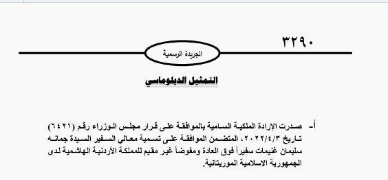 وكالة الناس –  صدرت الإرادة الملكية السامية بالموافقة على قرار مجلس الوزراء المتضمن الموافقة على تسمية السفيرة جمانة غنيمات سفيرا فوق العادة ومفوضا غير مقيم للمملكة الأردنية الهاشمية لدى الجمهورية الاسلامية الموريتانية.