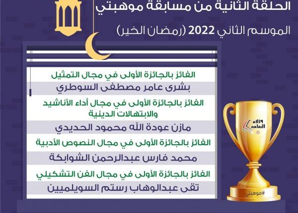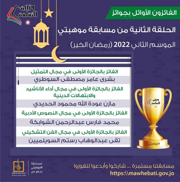 وكالة الناس –  أعلنت وزارة الثقافة مساء اليوم الأربعاء، عبر منصاتها على مواقع التواصل الاجتماعي، نتائج الحلقة الثانية من مسابقة “موهبتي” في موسمها الثاني والتي أقيمت خلال شهر رمضان الفضيل.