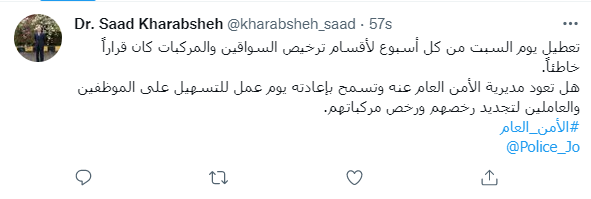 الخرابشة: قرار تعطيل يوم السبت لأقسام الترخيص كان خاطئًا On مايو 6, 2022 Share وكالة الناس – قال الوزير الأسبق الدكتور سعد الخرابشة إن قرار تعطيل يوم السبت من كل أسبوع لأقسام ترخيص السواقين والمركبات، كان قرارًا خاطئًا. وتساءل في تغريدة له عبر تويتر، ، “هل تعود مديرية الأمن العام عنه وتسمح بإعادته يوم عمل للتسهيل على الموظفين والعاملين لتجديد رخصهم ورخص مركباتهم؟”. .
