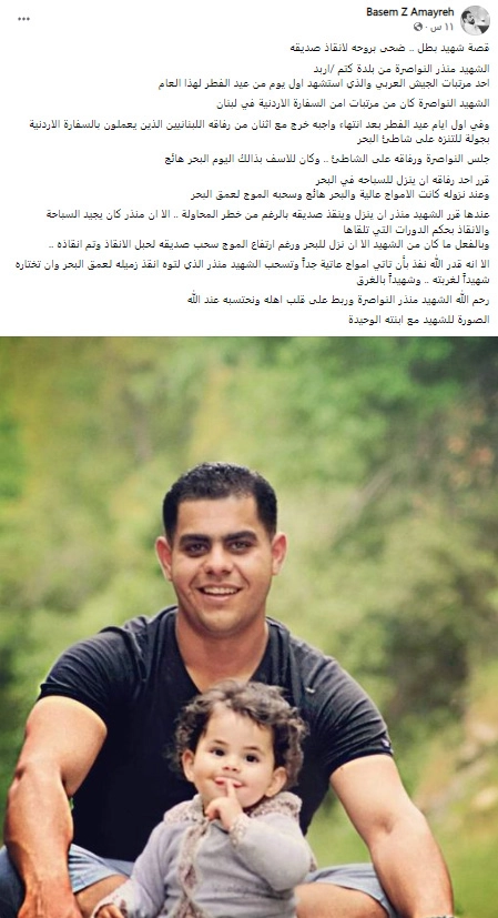 وكالة الناس – روى ناشطون قصة الشهيد منذر النواصرة مرتبات الجيش العربي الذي كان يعمل ضمن مرتبات امن السفارة الاردنية في لبنان ، والذي توفي بحادث غرق في لبنان.