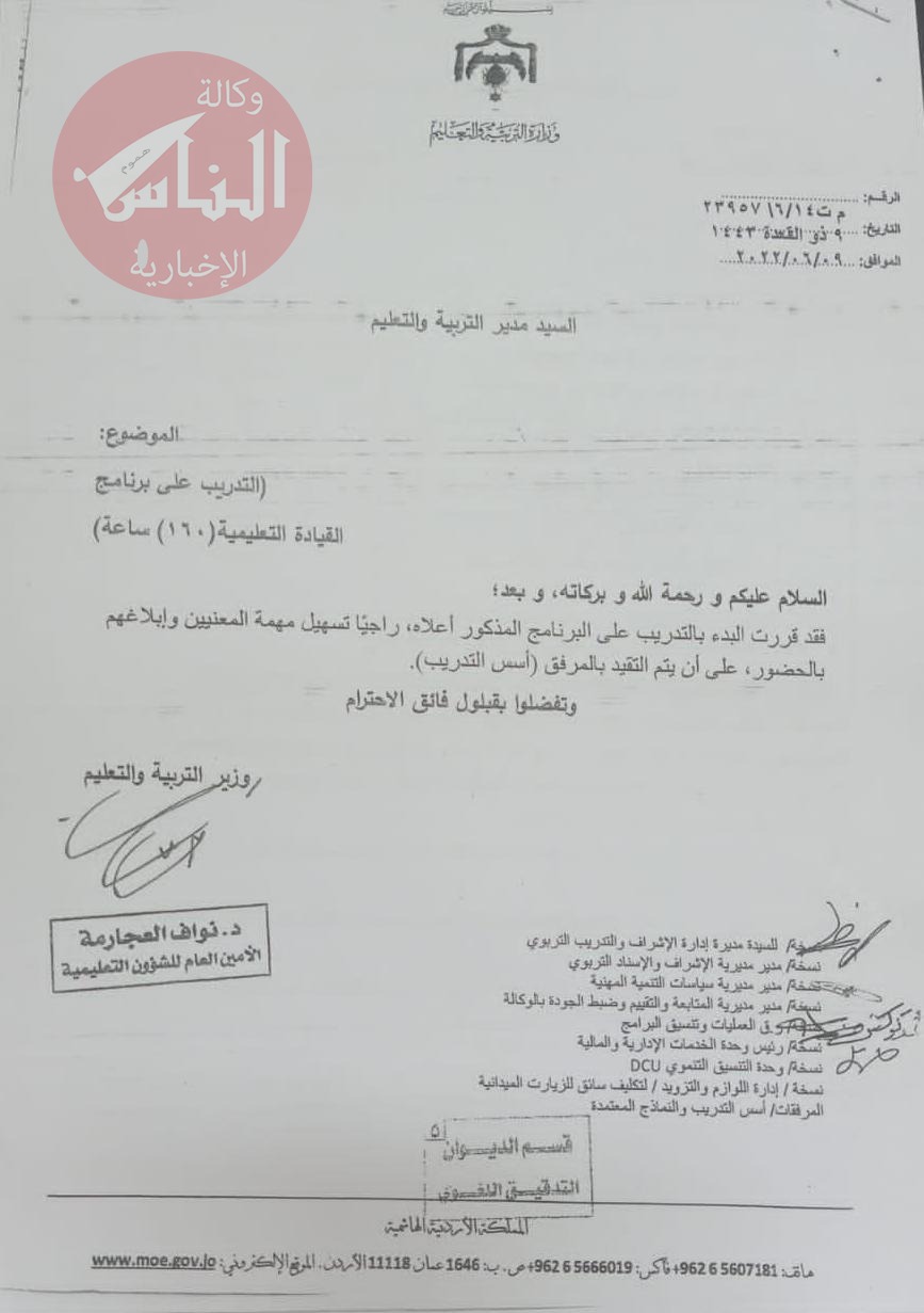 وجاء في التعليمات المرفقة بالكتاب ان الأولوية للمدربين المحوريين على البرنامج ستكون للمدرجة اسمائهم في كتاب سابق صدر بتاريخ 28 / 7 / 2020 والتي تضمنت اسماء 114مدرب ومدربة