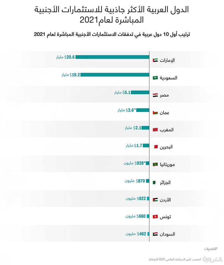 إليكم في الإنفوغرافيك أعلاه ترتيب أكبر 10 دول عربية في تدفقات الاستثمار الأجنبي المباشر الوافدة لعام 2021.