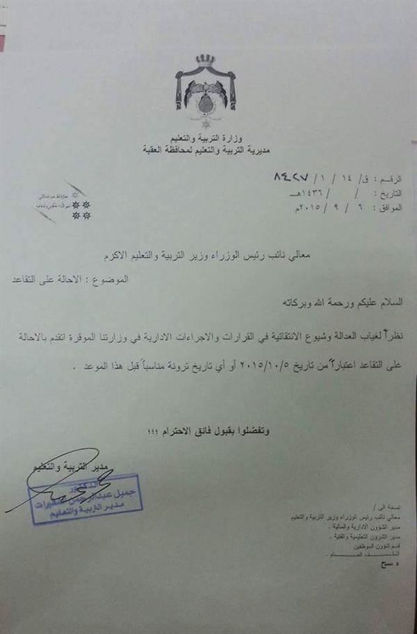 مدير تربية العقبة يحيل نفسه إلى التقاعد محتجا .. وثيقة