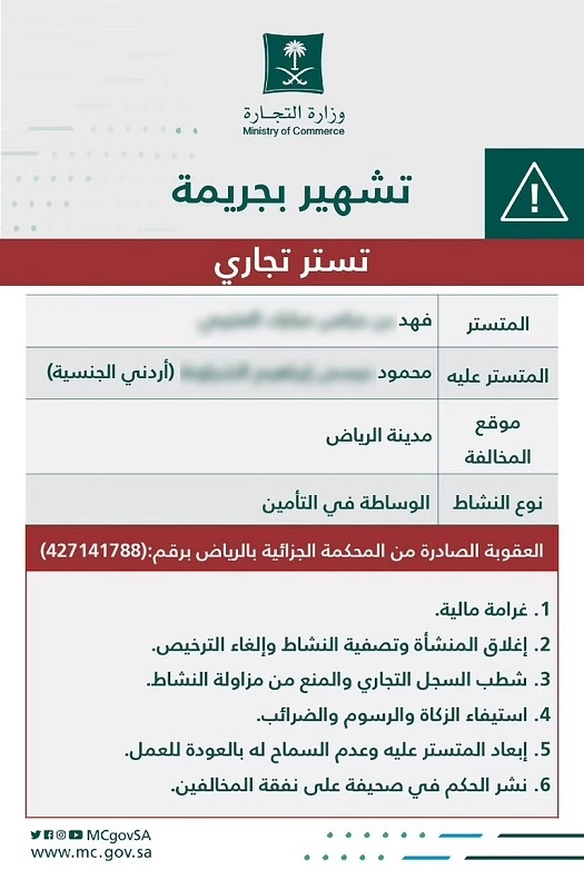وكالة الناس – شهرت وزارة التجارة السعودية بسعودي ومقيم أردني الجنسية (مع إبعاده) وذلك بعد صدور حكم قضائي يٌدينهما بارتكاب جريمة التستر التجاري في خدمات الوساطة في التأمين.