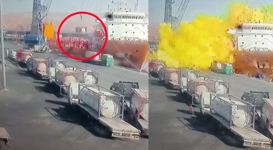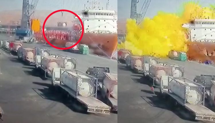 ويظهر الفيديو سقوط الخزان اثناء نقله من شاحنة الى اخرى ، وانفجاره مسفرا عن انطلاق غاز اصفر اللون ، وقيام العمال المتواجدين في الموقع بالهرب.