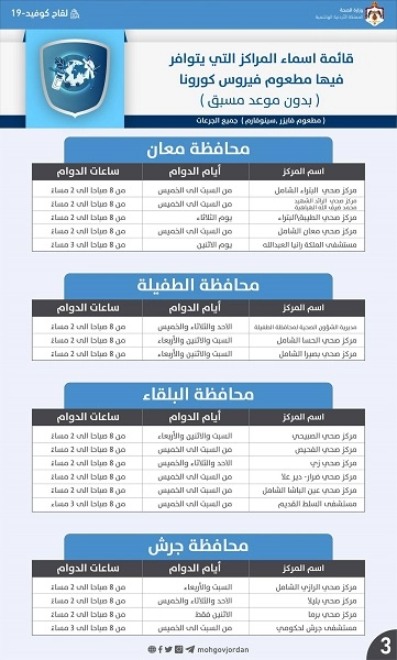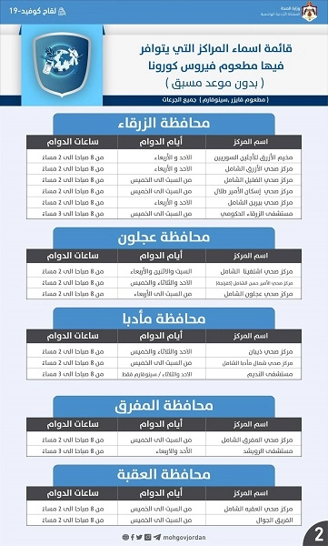 وكالة الناس – أعلنت وزارة الصحة ‏قائمة اسماء المراكز التي يتوافر فيها مطعوم فيروس كورونا (بدون موعد مسبق) ‎جميع الجرعات ,(من 2022/7/16 – 2022/7/21) حسب التالي: