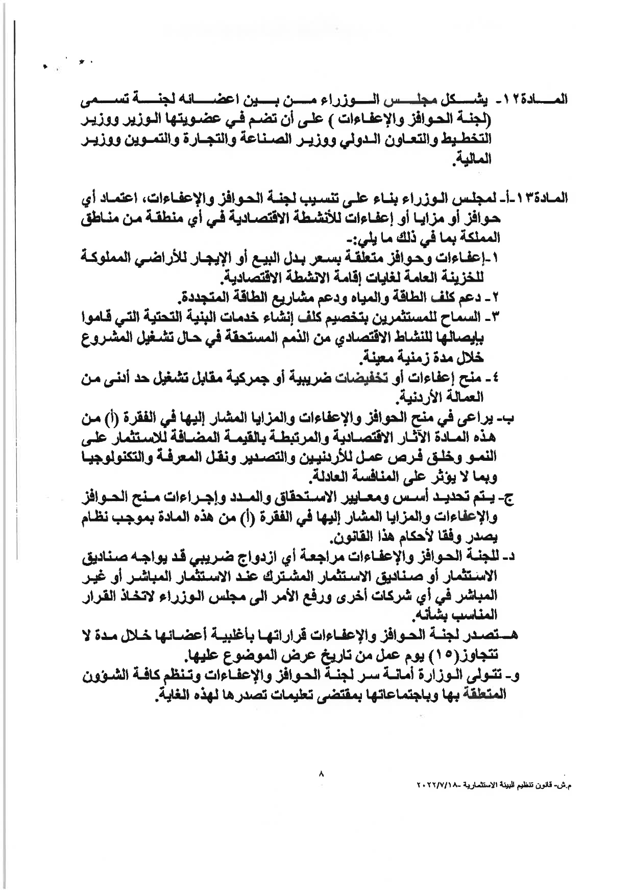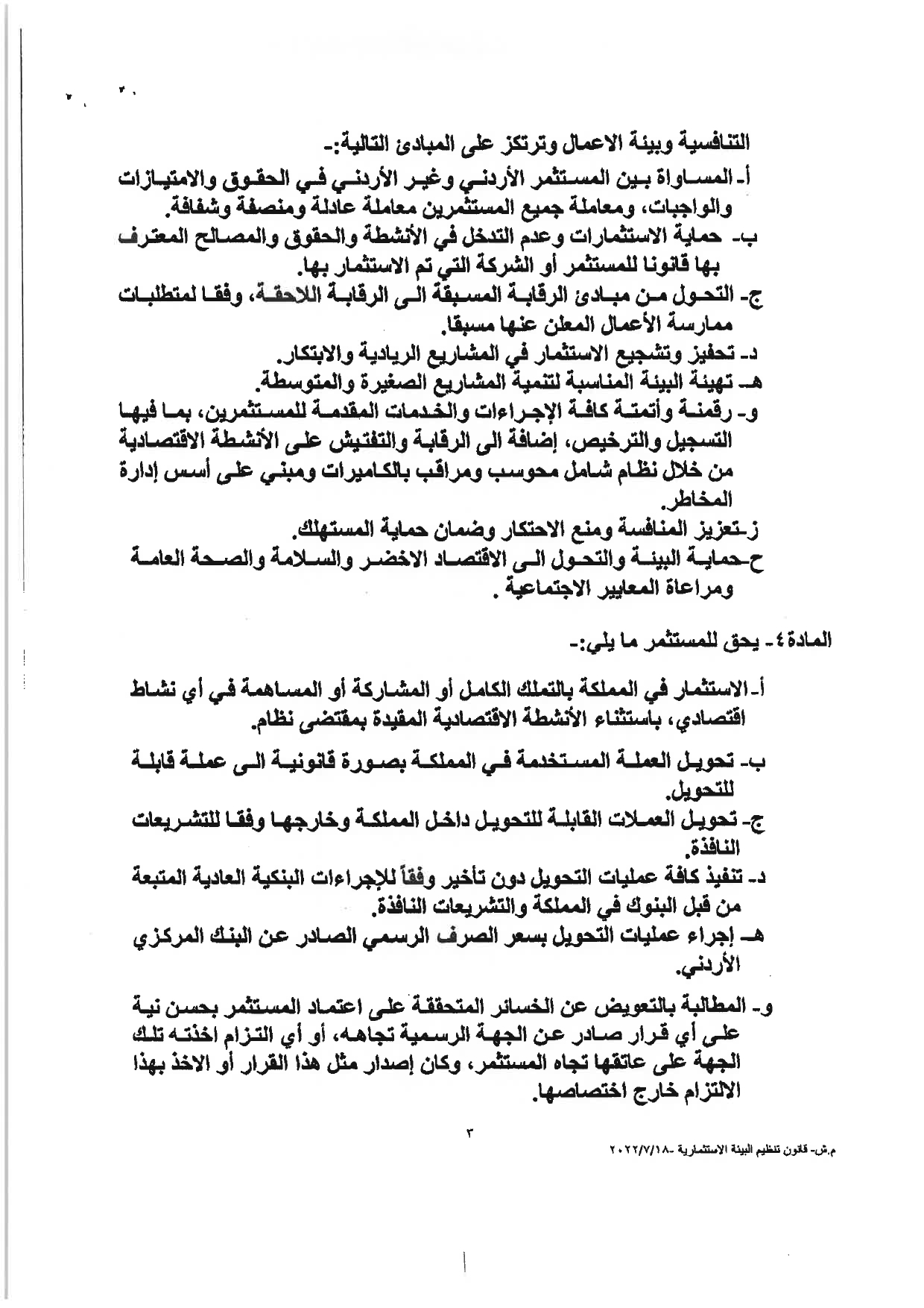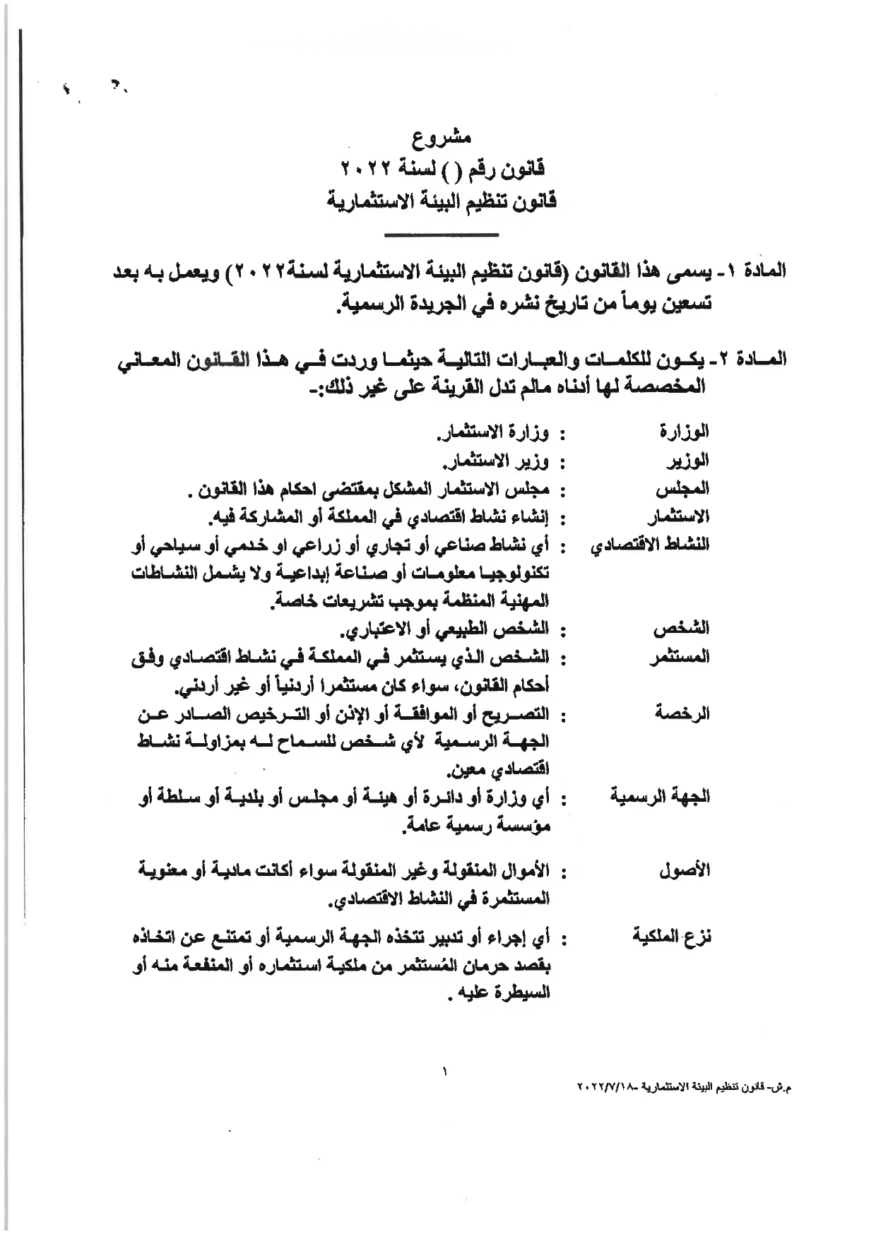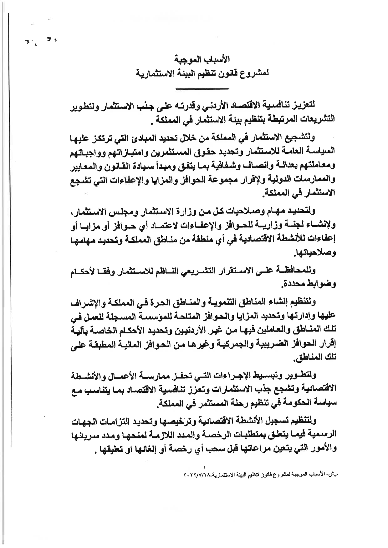 وكالة الناس – نشرت الحكومة مساء الثلاثاء النصّ الكامل لمشروع قانون تنظيم البيئة الاستثماريَّة، والأسباب الموجبة له، والذي أقرَّه مجلس الوزراء يوم الأحد الماضي، وأحالته الحكومة إلى مجلس النوَّاب الذي سيشرع بمناقشته خلال الدَّورة البرلمانيَّة الاستثنائيَّة، التي ستبدأ يوم غدٍ الأربعاء.