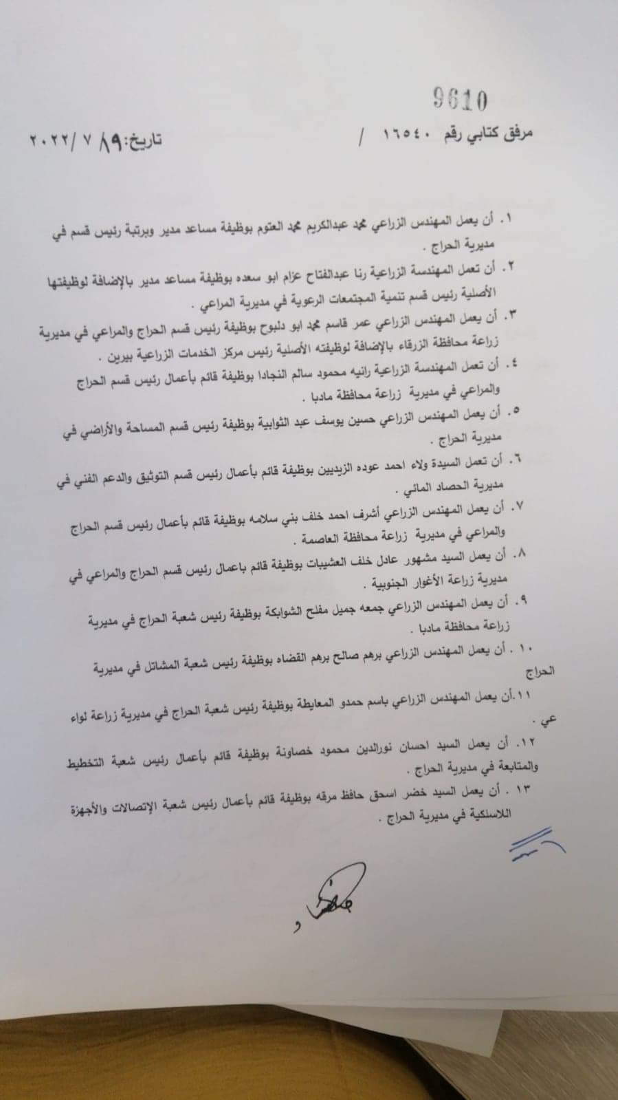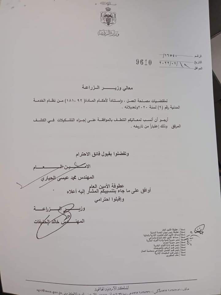 وكالة الناس –  قرر وزير الزراعة المهندس خالد الحنيفات اجراء تشكيلات إدارية في مختلف مديريات الوزارة.