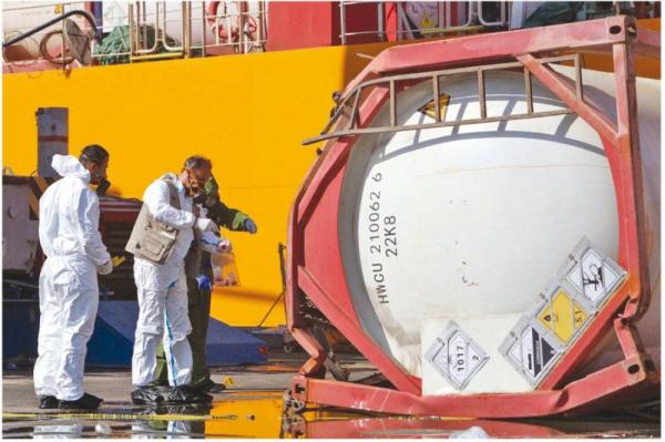 وبحدود الساعة السابعة والنصف من صباح اليوم التالي، وبعد أن أصبح الموقع آمناً، تم الكشف على الموقع (الرصيف، السفينة، الحاوية ومحيطها)، من قبل المدعي العام، يرافقه مدير إدارة المختبرات والأدلة الجرمية، وفريق من خبراء المختبر الجنائي، حيث تم معاينة الموقع، وتحريز العينات، وتم تنزيل قطعة السلك المعدني المتبقي على الهوك (الحبل) وتحريزه، وتصوير الموقع، كما تم ضبط جهاز (DVR) لكاميرا موجودة على الرافعة، وقد ورد تقرير المختبر الجنائي مرفق معه ألبوم صور.