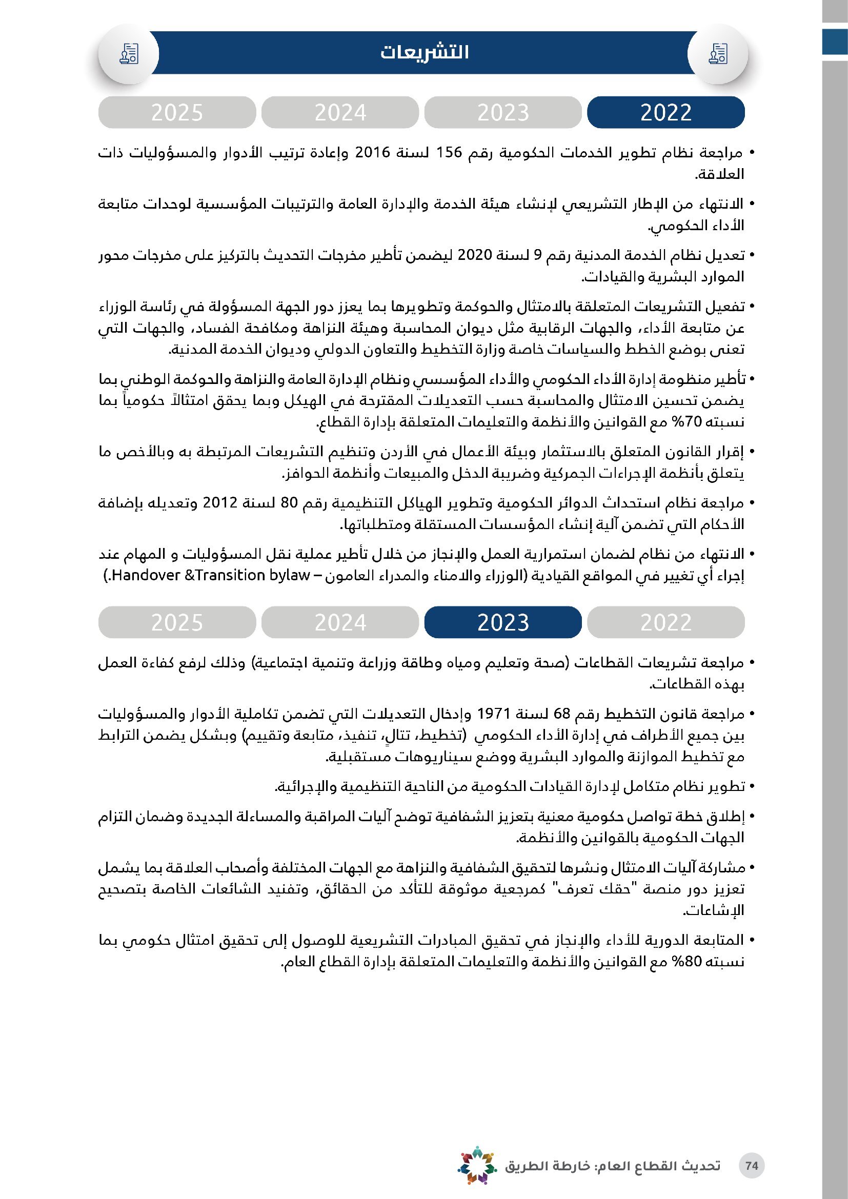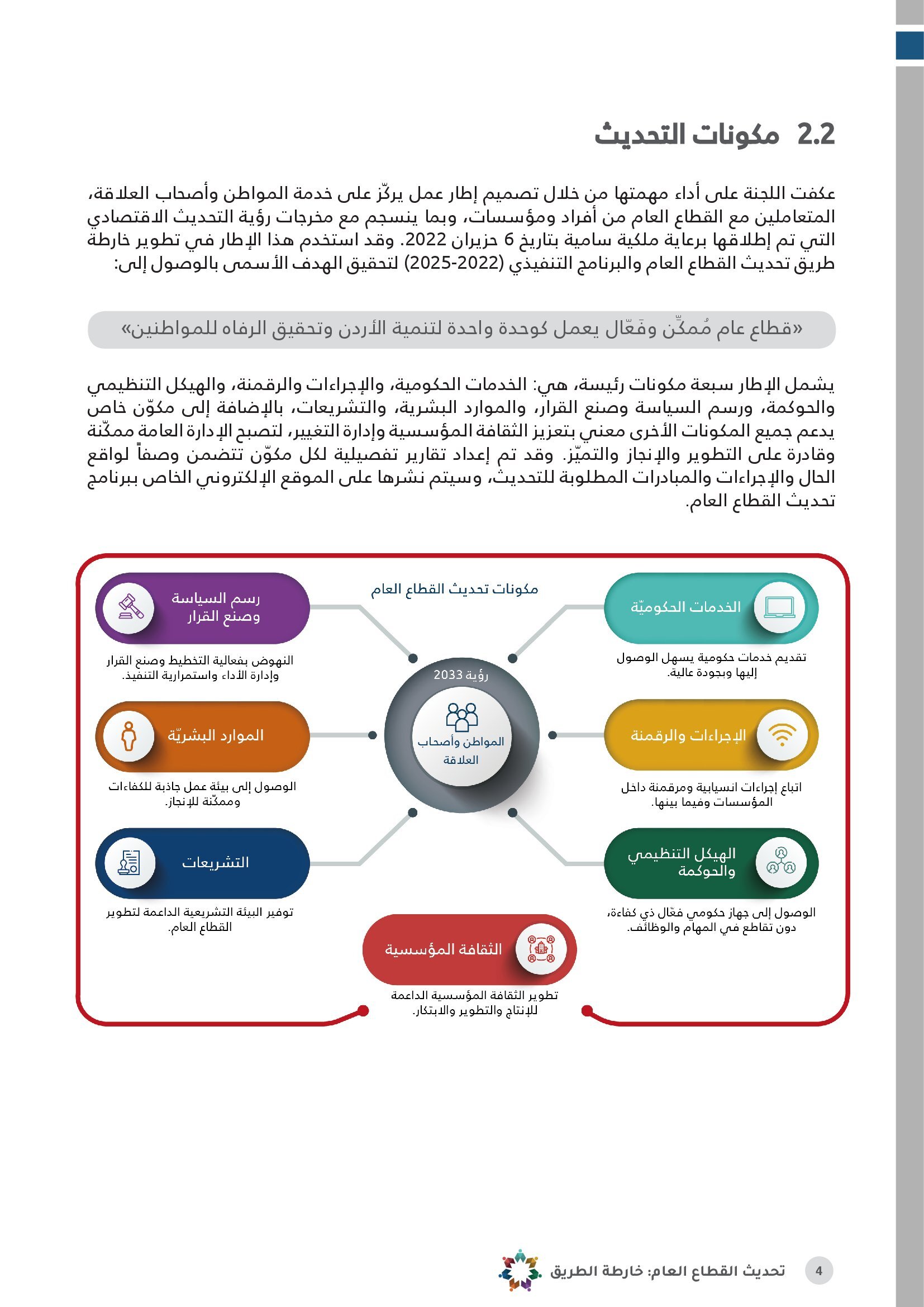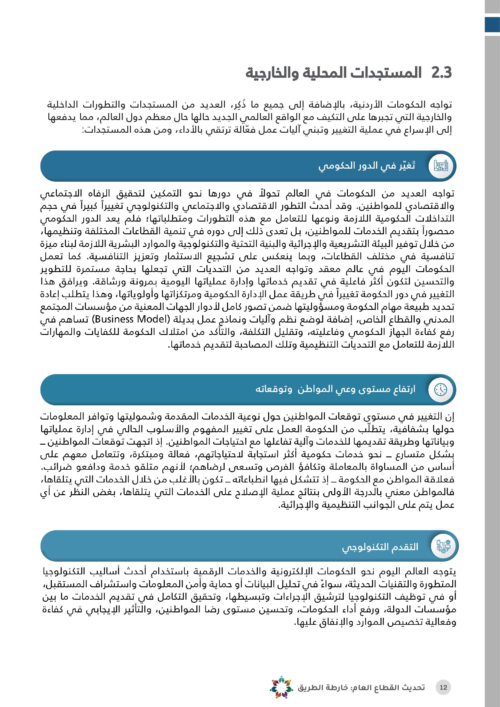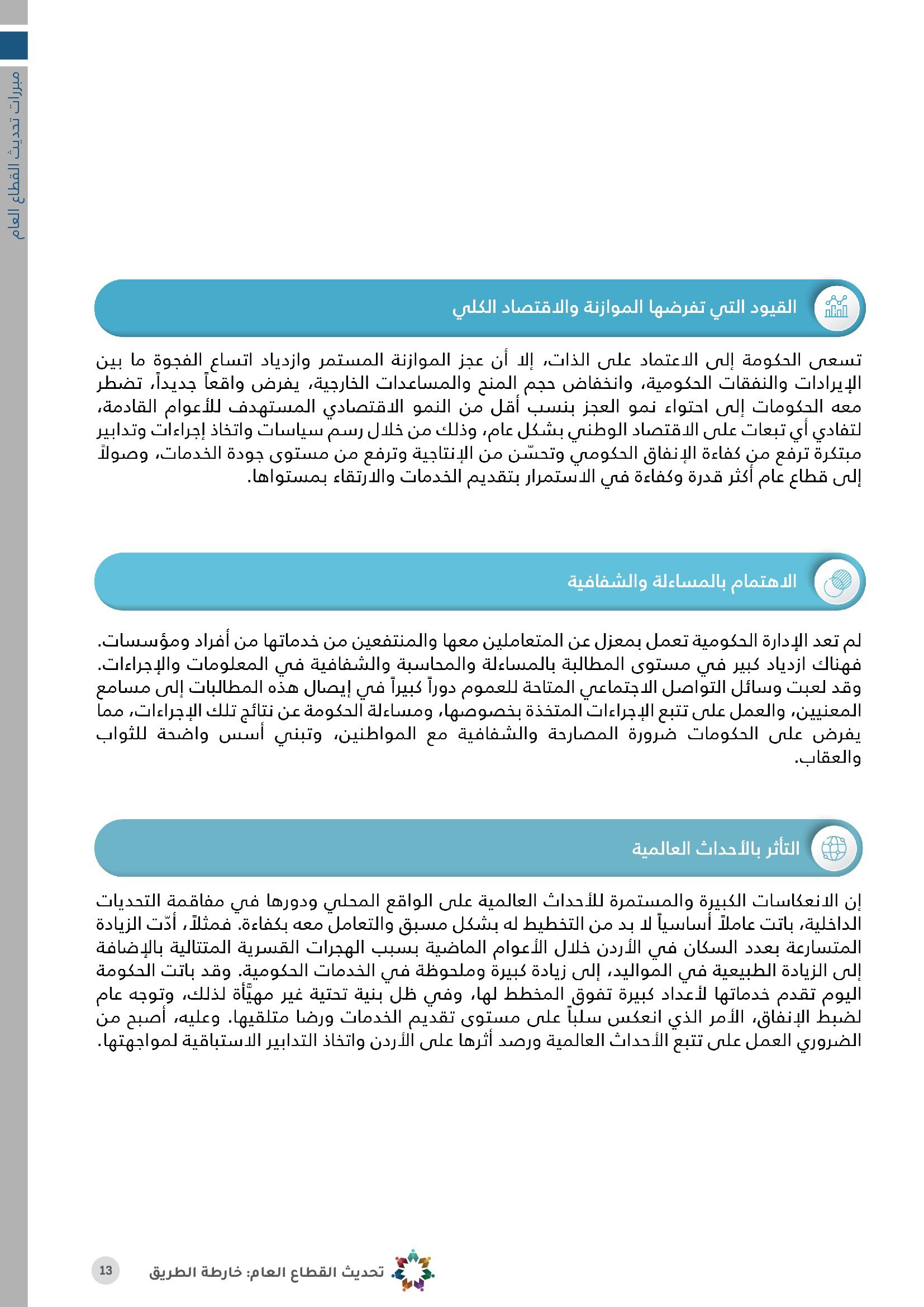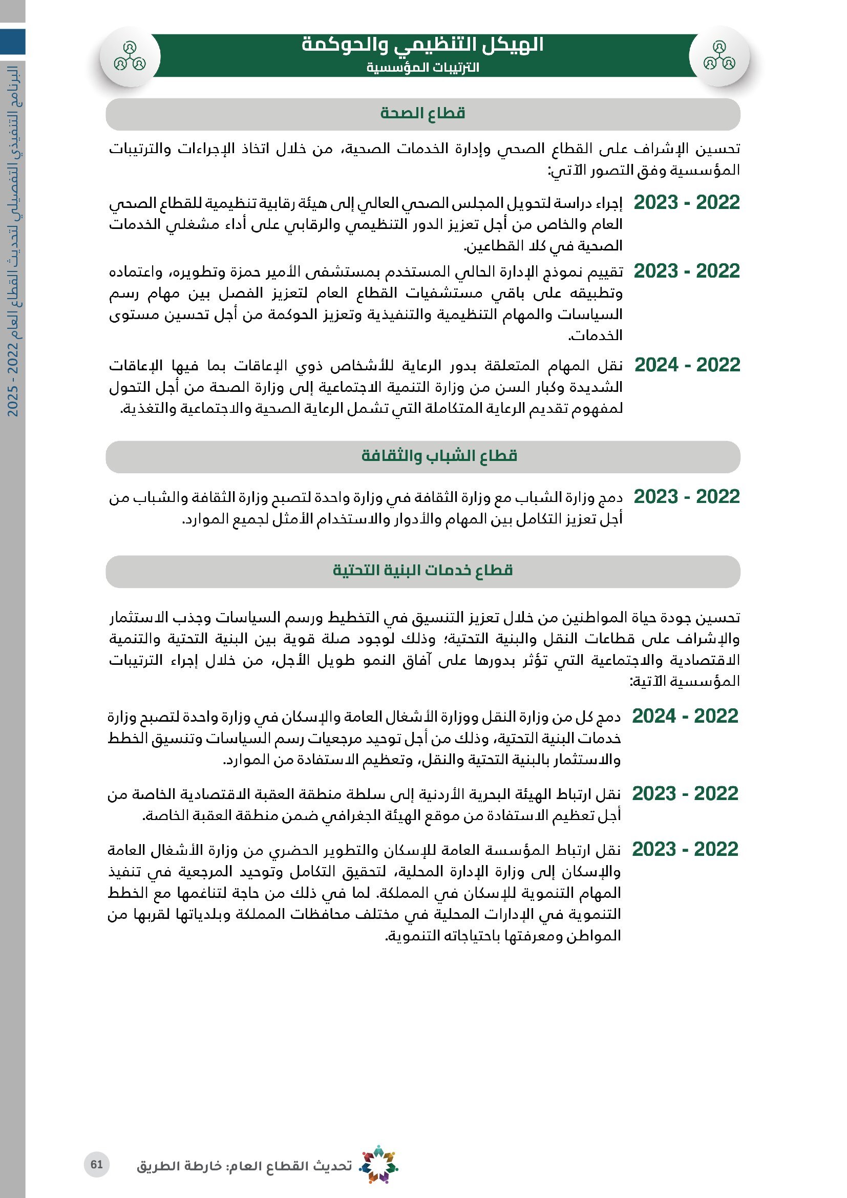 رئيس الوزراء الدكتور بشر الخصاونة، قال إن الخطة تبدأ اعمالها هذا العام وتستمر إلى العام 2025 لنصل إلى قطاع عام ممكن يحقق التنمية للاردن والرفاه للمواطنين.