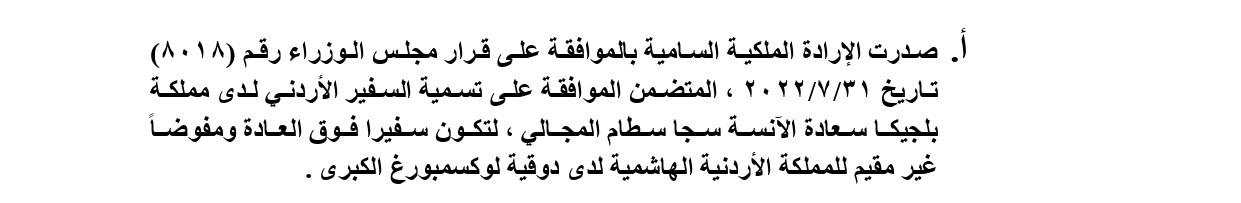 إرادة ملكية بتسمية المجالي سفيرًا لدى لوكسمبورغ On أغسطس 16, 2022 Share وكالة الناس – صدرت الإرادة الملكية السامية بالموافقة على قرار مجلس الوزراء المتضمن الموافقة على تسمية السفير الأردني لدى مملكة بلجيكا سجا المجالي؛ لتكون سفيرة فوق العادة ومفوضًا غير مقيم للمملكة لدى دوقية لوكسمبورغ الكبرى.