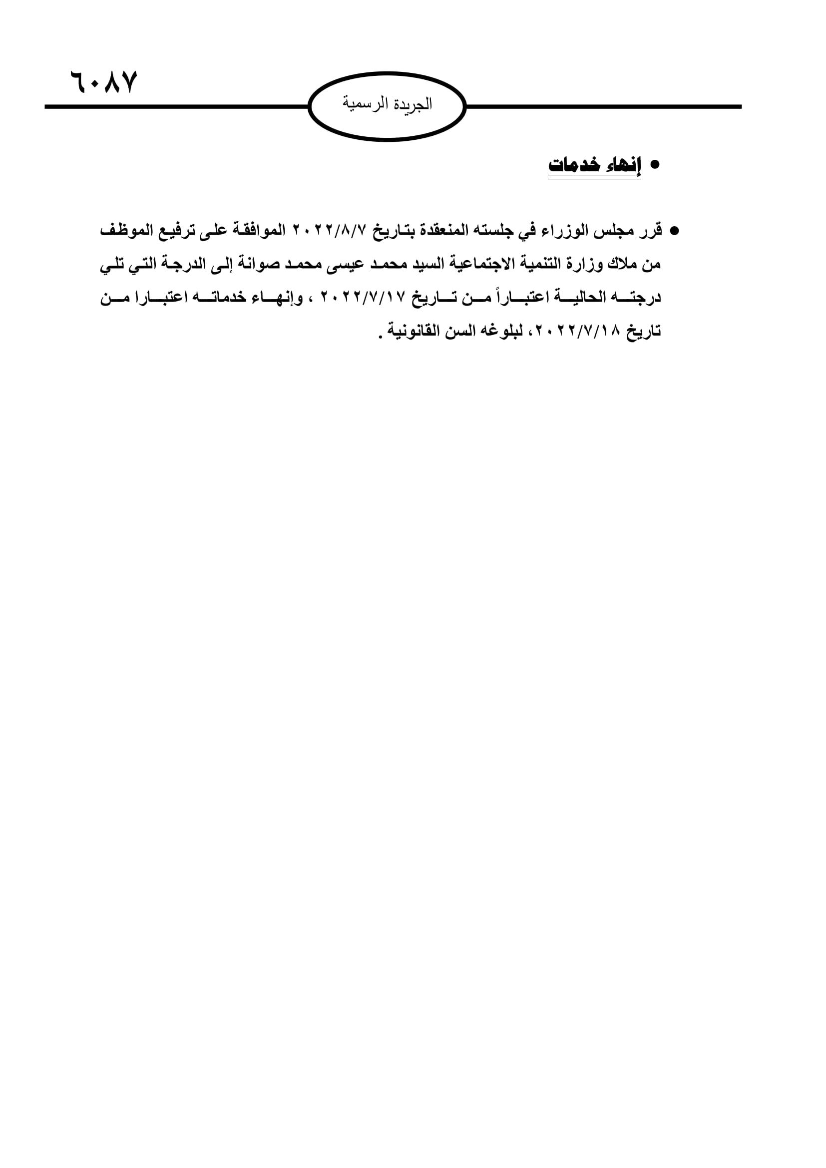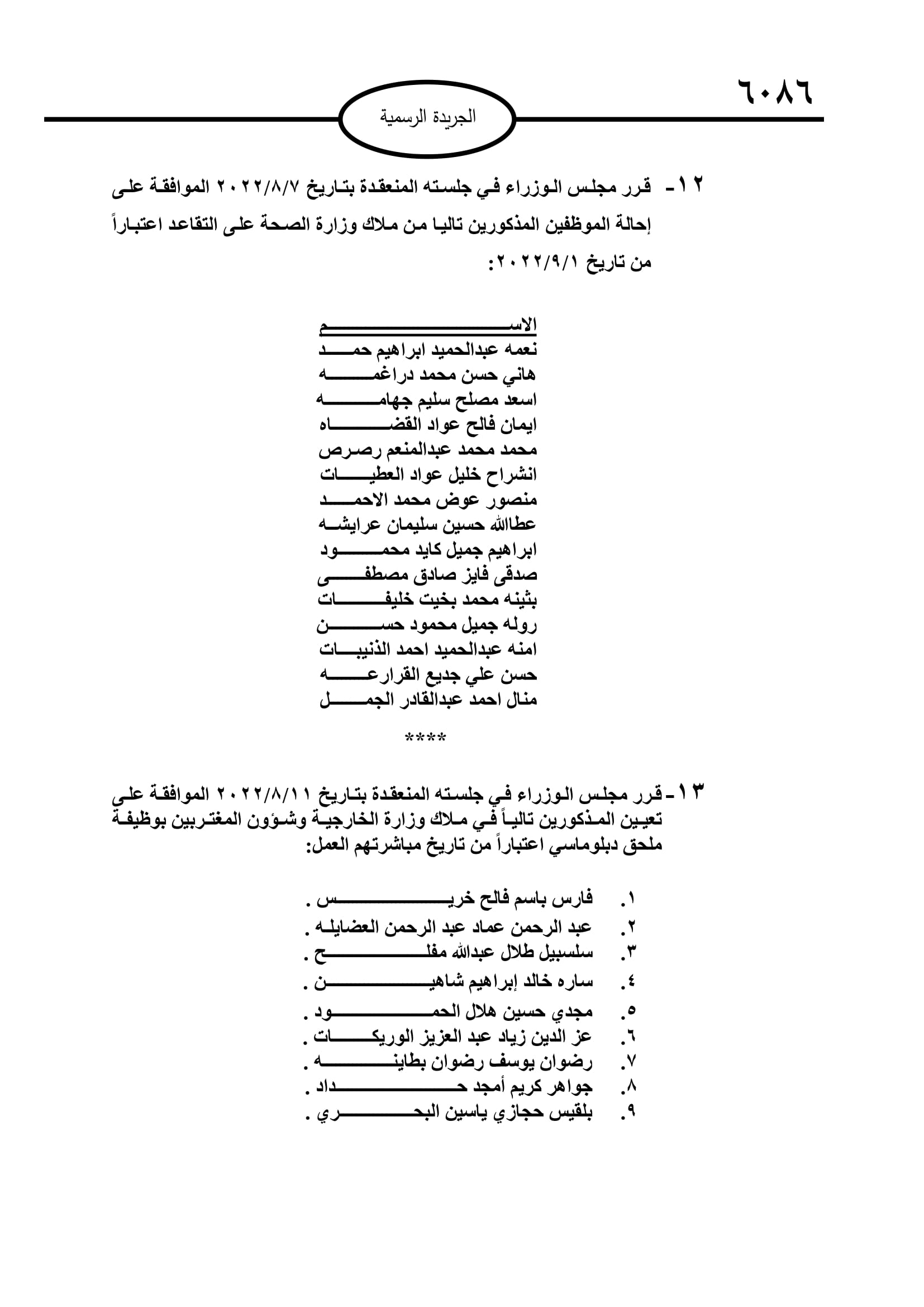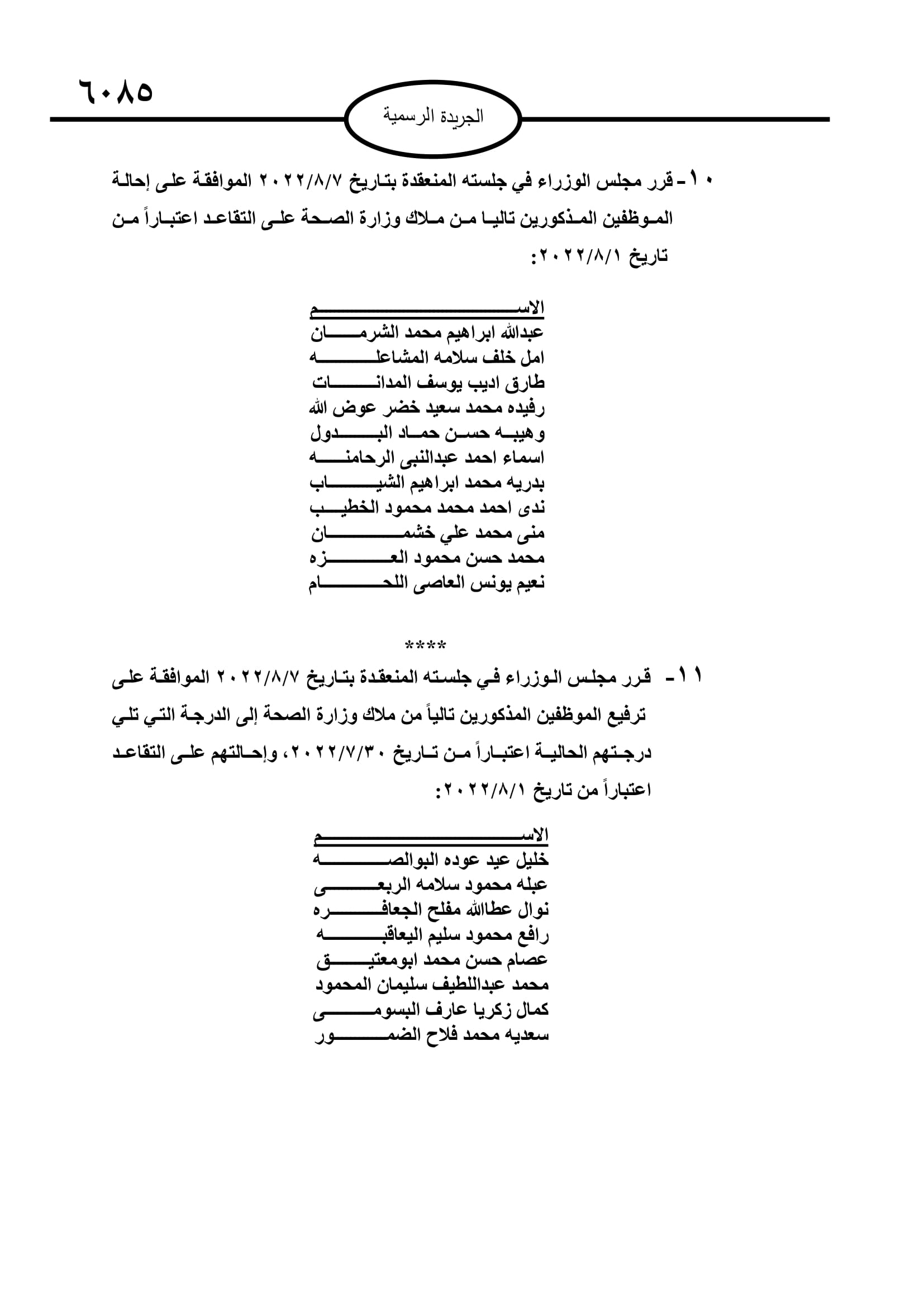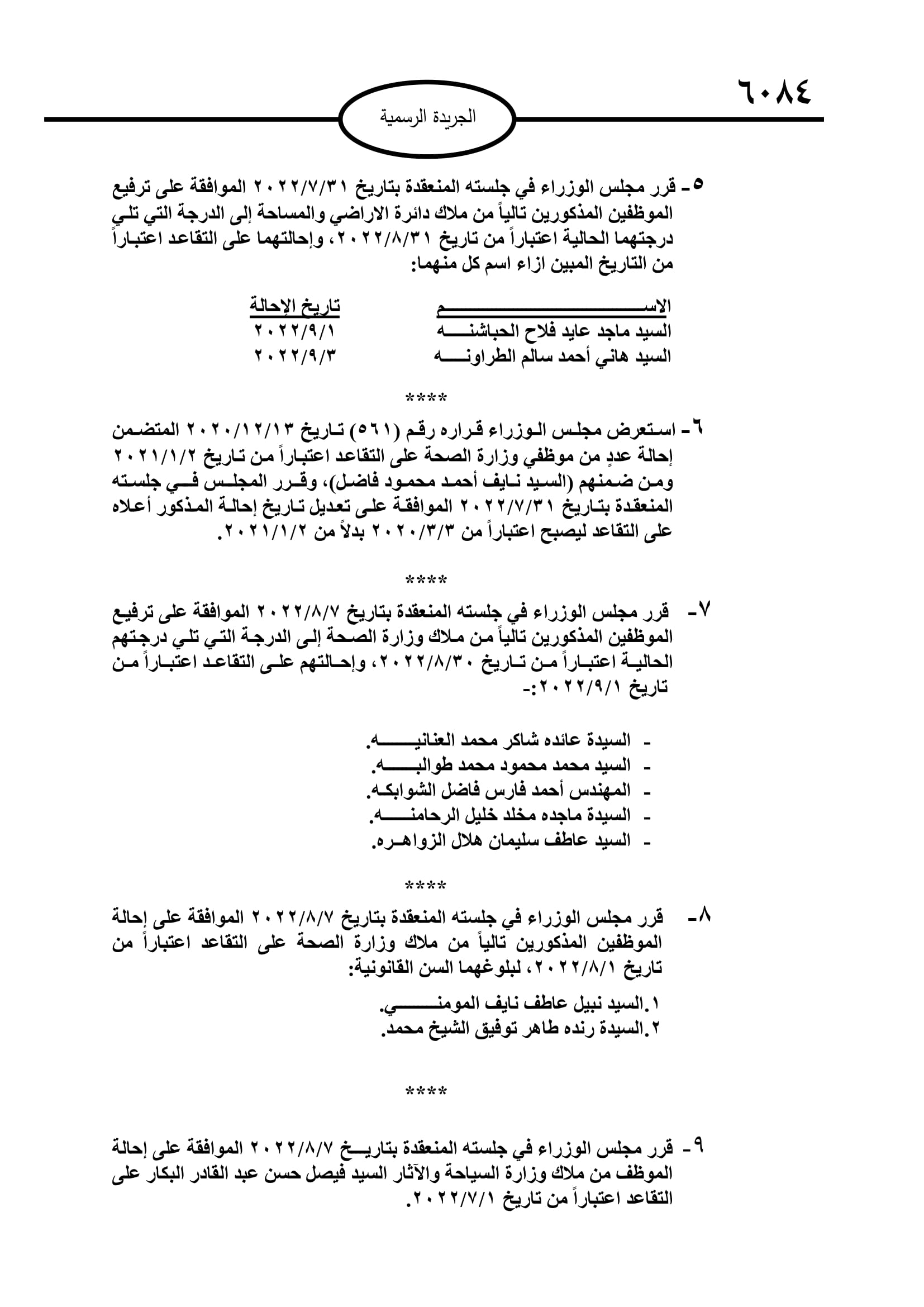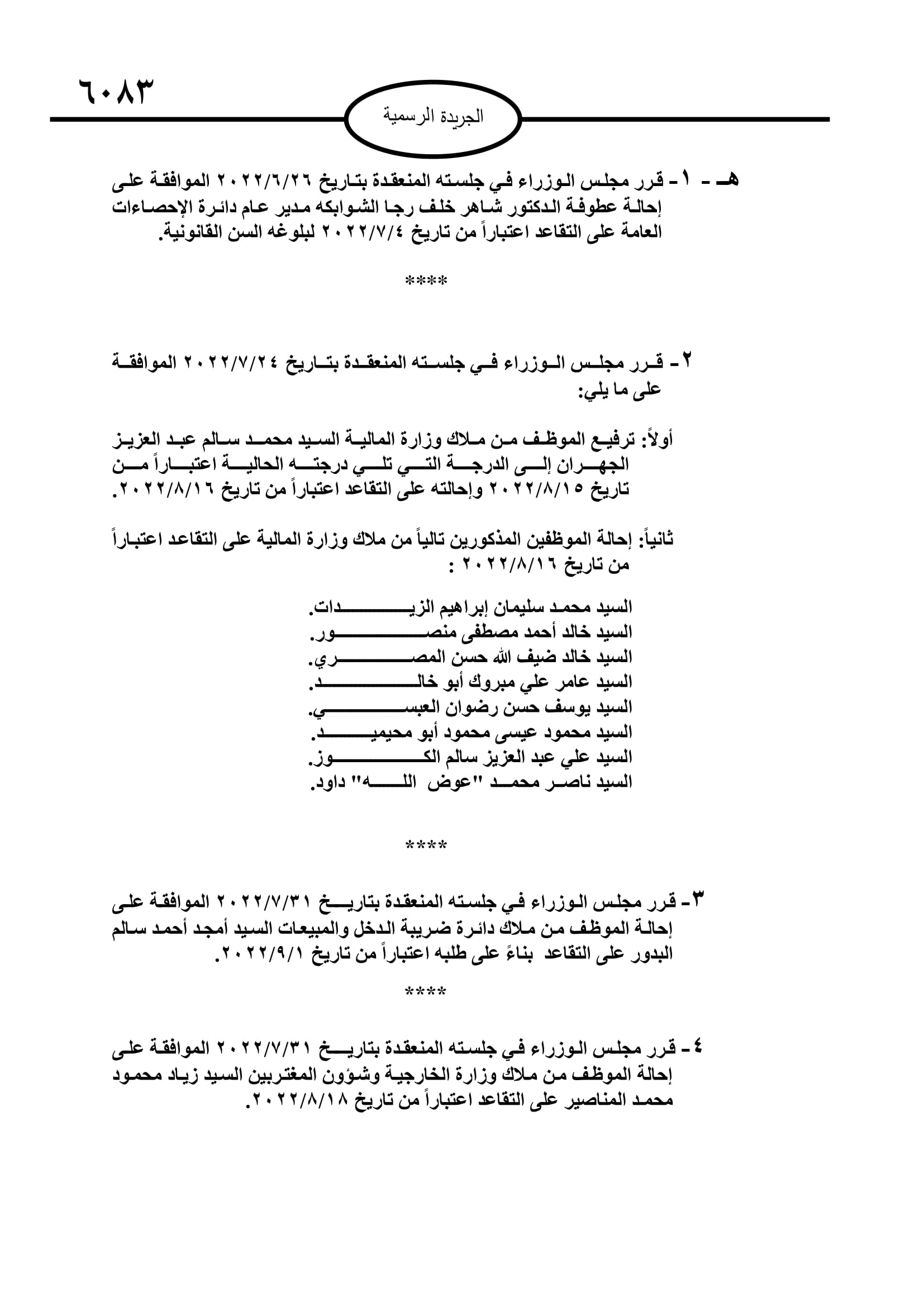وكالة الناس –  صدر في عدد الجريدة الرسمية اليوم الثلاثاء قرارت مجلس الوزراء بالموافقة على إحالة عدد من موظفي الدولة إلى التقاعد.
