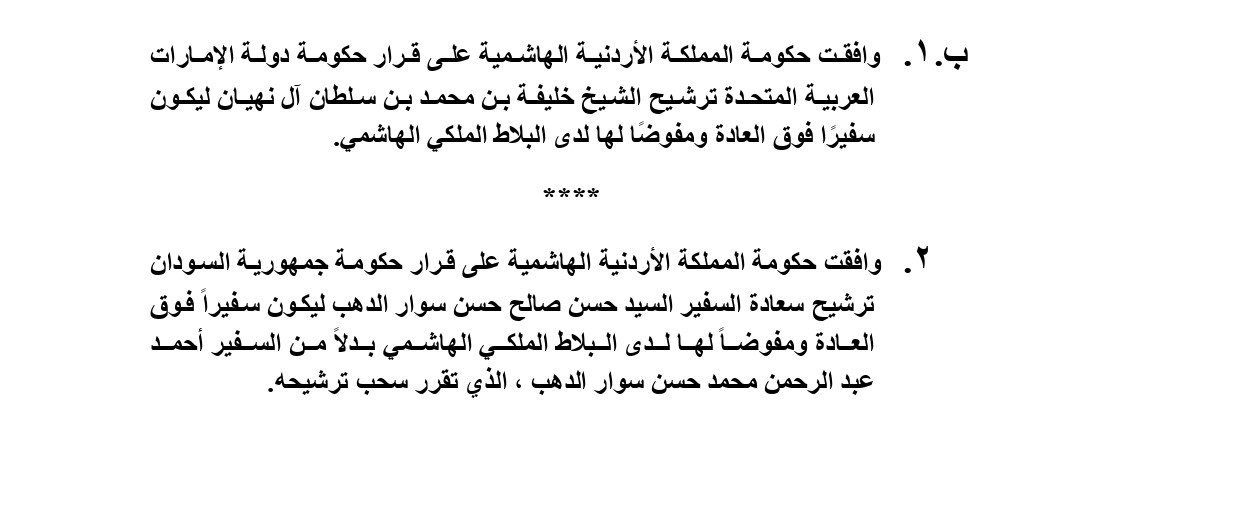 ووافقت الحكومة على قرار حكومة جمهورية السودان بشأن ترشيح السفير حسن صالح حسن صالح حسن سوار الدهب ليكون سفيرا فوق العادة ومفوضا لها لدى البلاط الملكي الهاشمي بدلا من السفير أحمد عبد الرحمن محمد حسن الدهب، الذي تقرر سحب ترشيحه.