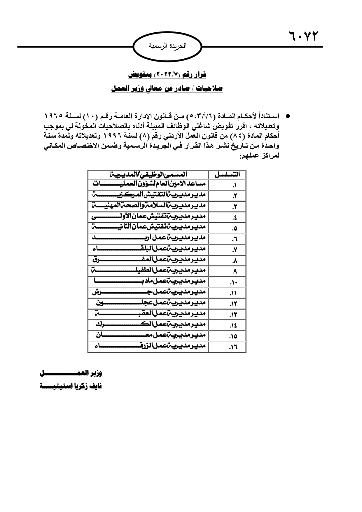 ونقل استيتية الصلاحيات إلى كل من؛ مساعد الأمين العام لشؤون العمليات، ومدير مديرية التفتيش المركزية، ومدير مديرية السلامة والصحة المهنية، ومدير مديرية تفتيش عمان الأولى، ومدير مديرية تفتيش عمان الثانية، ومدير مديرية عمل إربد، ومدير مديرية عمل البلقاء، ومدير مديرية عمل المفرق، ومدير مديرية عمل الطفيلة، ومدير مديرية مأدبا، ومدير مديرية عمل جرش، ومدير مديرية عمل عجلون، ومدير مديرية عمل العقبة، ومدير مديرية عمل العقبة، ومدير مديرية عمل الكرك، ومدير مديرية عمل معان، ومدير مديرية الزرقاء.