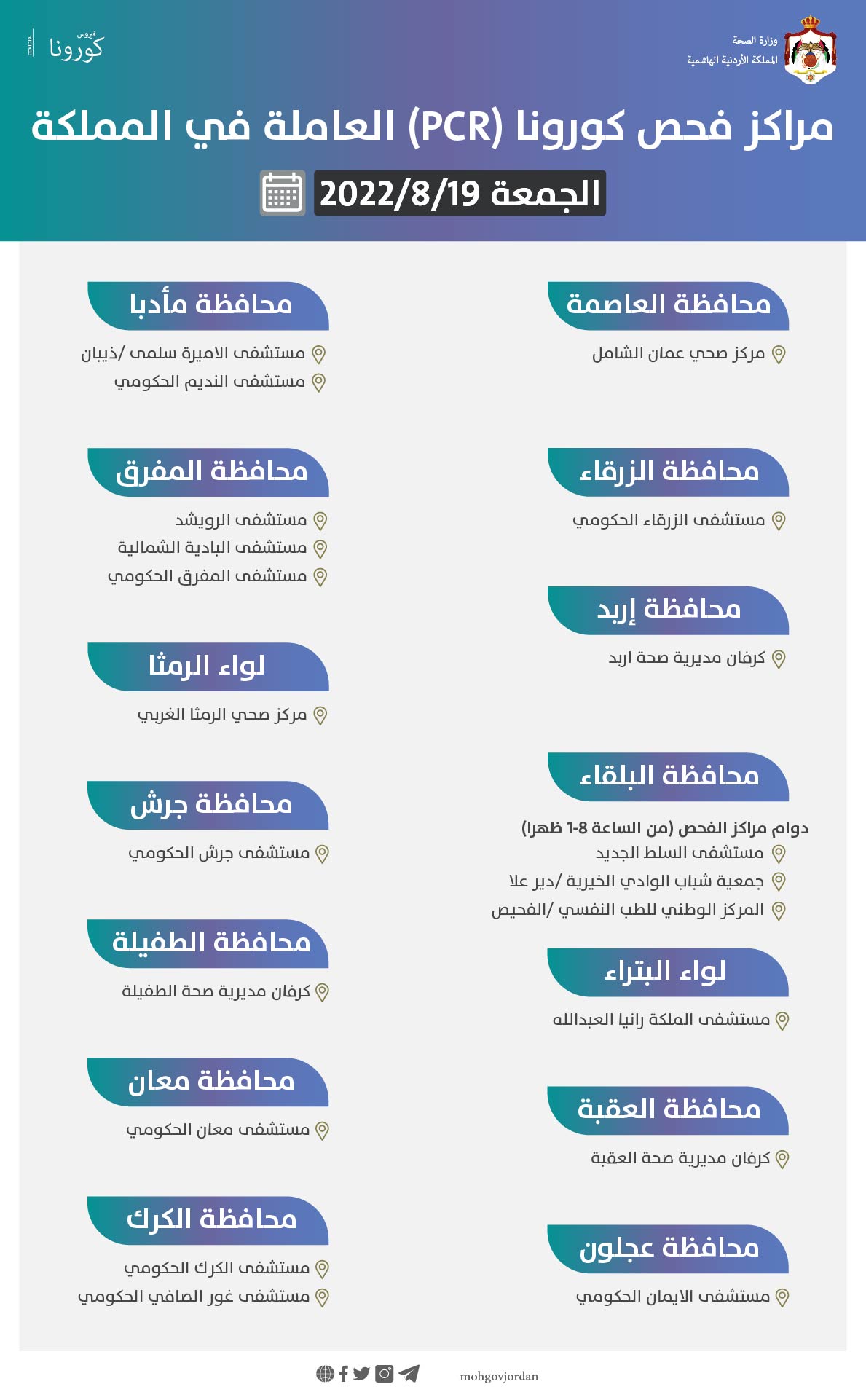 مراكز فحص كورونا العاملة الجمعة (أسماء) On أغسطس 19, 2022 Share وكالة الناس – أعلنت وزارة الصحة، عن مراكز فحص كورونا (PCR) العاملة في المملكة ليوم غد الجمعة. وقالت الوزارة إن دوام مراكز الفحص من الساعة 9:00 صباحاً – 2:00 مساء وتاليا المراكز:
