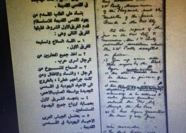 صورة لوثيقة استسلام جيش الاحتلال للجيش الأردني في 1948 ( شاهد )
