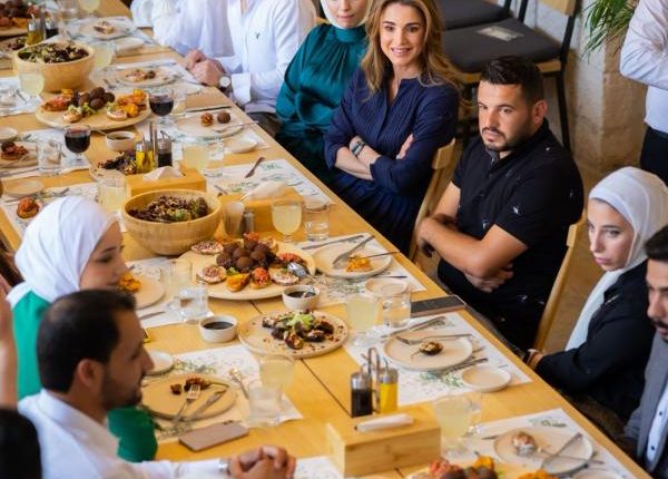 وفي مطبخ المطعم ألقت جلالتها التحية على صاحب مطعم بيت خروب ركان مهيار وموظفي المطعم الذي يعتبر من المطاعم التي تحافظ على الاكل التراثي وتعتمد في مكونات الاطباق على منتجات الحقل الطبيعية.