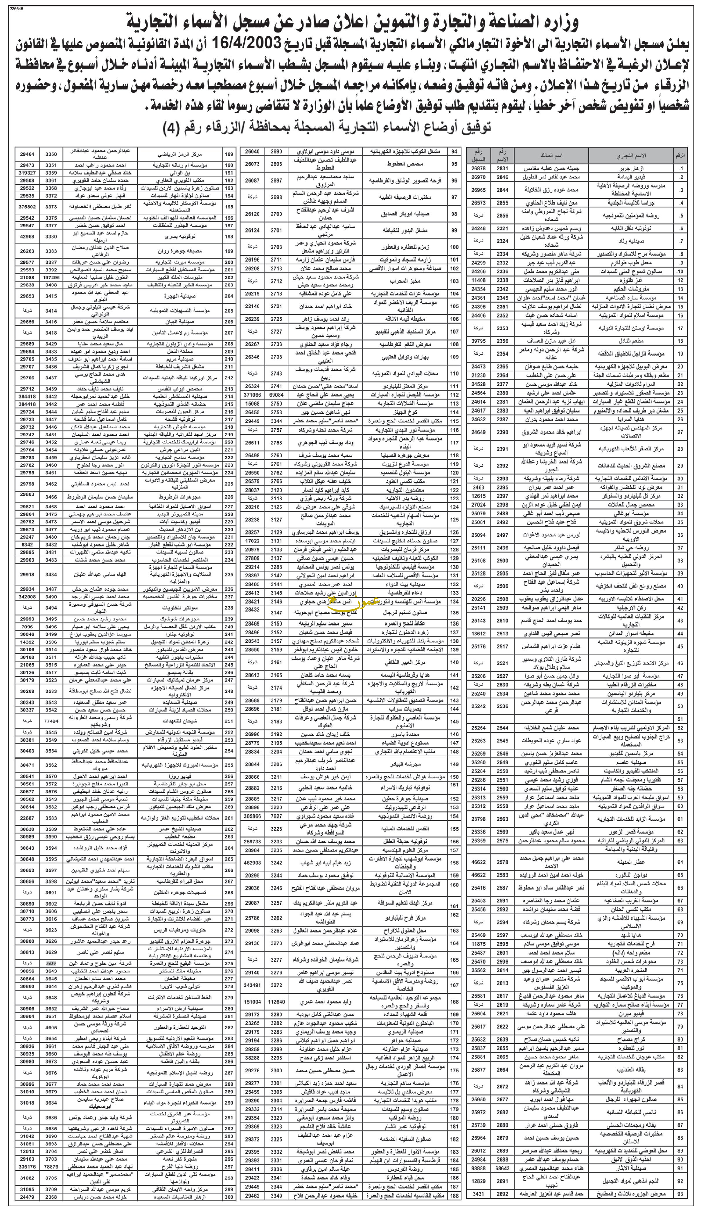 وأضاف مسجل الأسماء التجارية، في إعلان نشر عبر الصحف اليومية، “سنقوم بشطب الأسماء التجارية المبينة أدناه خلال أسبوع في محافظة الزرقاء”، مشيرا إلى أن عدد الأسماء التجارية تصل إلى 300.