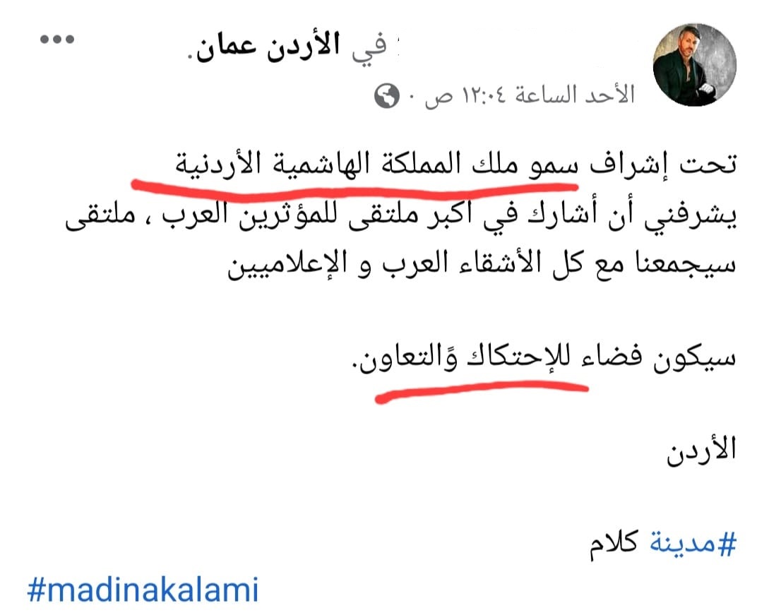 وتداول صحفيون تغريدة لاحد ما سمي بــ ” المؤثرين” ، وهو يصف جلالة الملك بــ ” سمو الملك ..”، ويعبر عن سعادته بــ ” الاحتكاك” ، في اشارة واضحة الى ضحالة ثقافة بعض ” المؤثرين” الذين احتفت بهم الحكومة .