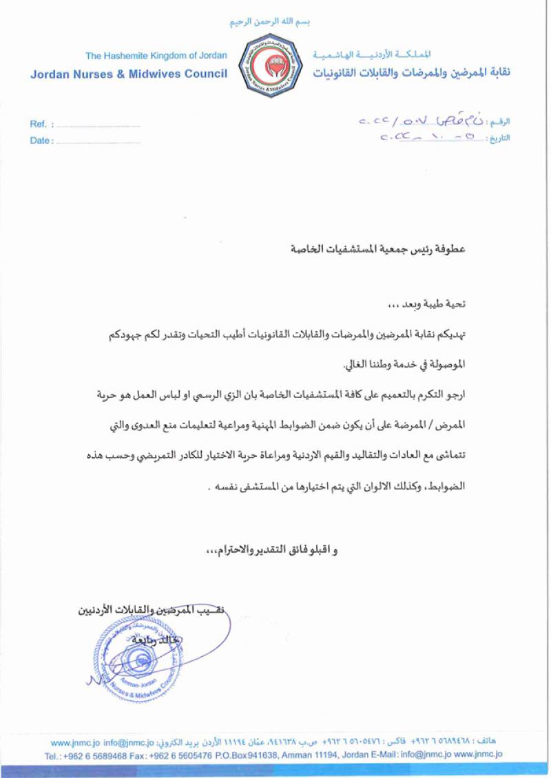 وكالة الناس – طالبت نقابة الممرضين والممرضات والقابلات القانونيات جمعية المستشفيات الخاصة التعميم على جميع المستشفيات الخاصة ان الزي الرسمي ولباس الممرض والممرضة هو حرية شخصية شريطة ان يكون ضمن الضوابط المهنية ومراعياً تعليمات منع العدوى التي تتماشى مع العادات والتقاليد والقيم الأردنية.