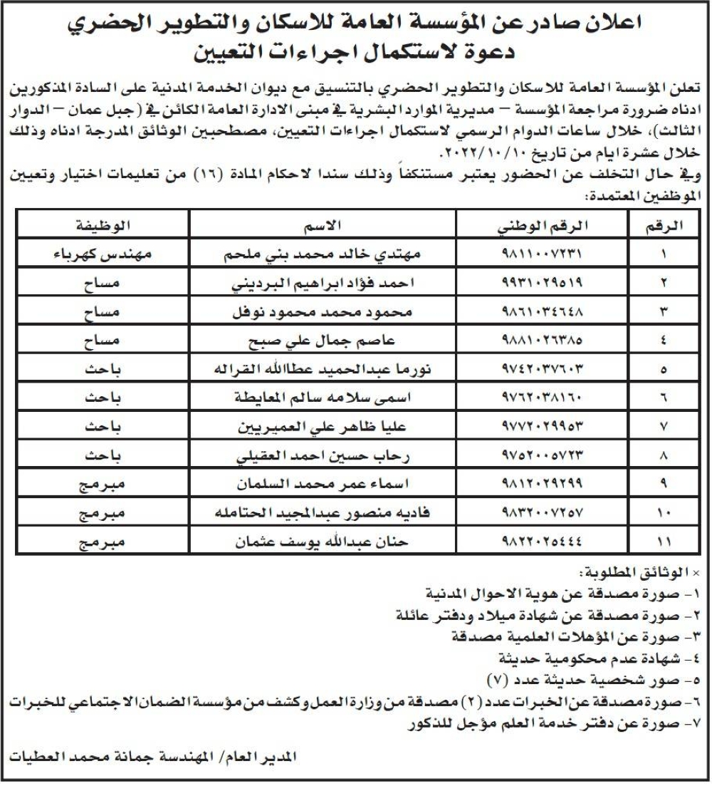 مدعوون لاستكمال اجراءات التعيين في المؤسسة العامة للاسكان ( أسماء )