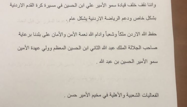 واننا في مخيم الوحدات ندعم ونساند قرار سمو الامير علي بن الحسين حفظه الله ورعاه
