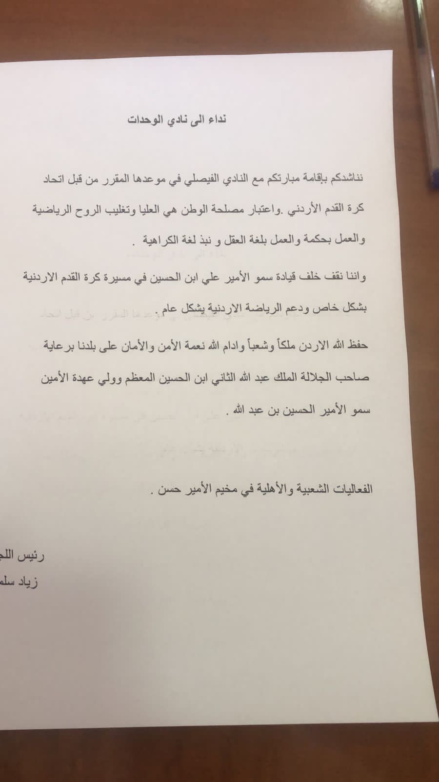 ومن هذا المنطق نناشد رئيس وادارة نادي الوحدات بتحكيم العقل ومصلحة الوطن ونبذ لغة الكريهة وتغليب الروح الرياضة وان يكون اللعب في اربد ودعم القرار الذي لم ينصف حق نادي الوحدات بإقامة مباراته على ارضه وان جميع مدن ومحافظات المملكة هي بيت للواحدتين كما هي لكل الأردنيين وثقتنا عالية بأجهزتنا الامنية بحفظ الامن في هذا الوطن الحبيب