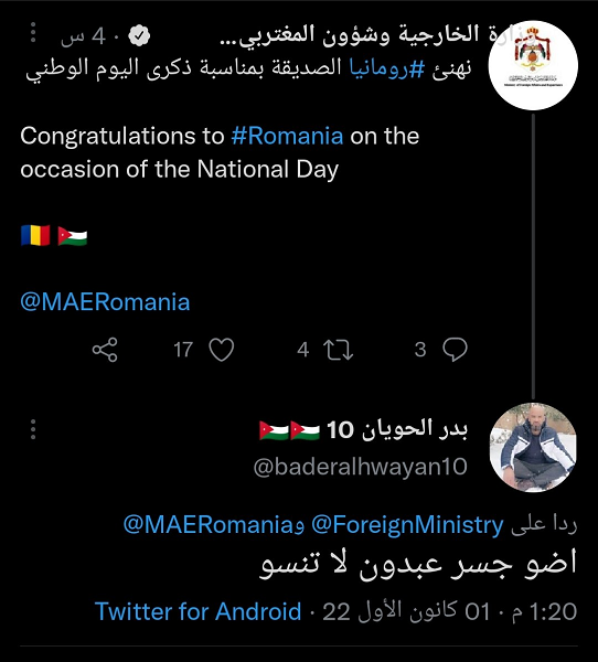 وكالة الناس – قام حساب وزارة الخارجية عبر موقع تويتر بعمل حضر لمواطن دعا لإضاءة جسر عبدون بمناسبة اليوم الوطني لرومانيا.