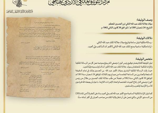 وتظهر الوثيقة نصّ كل من الرسالة الملكية والإرادة الملكية المتعلقتين بميلاد جلالة الملك عبدالله الثاني (الأمير آنذاك) وتسميته وليًّا للعهد.